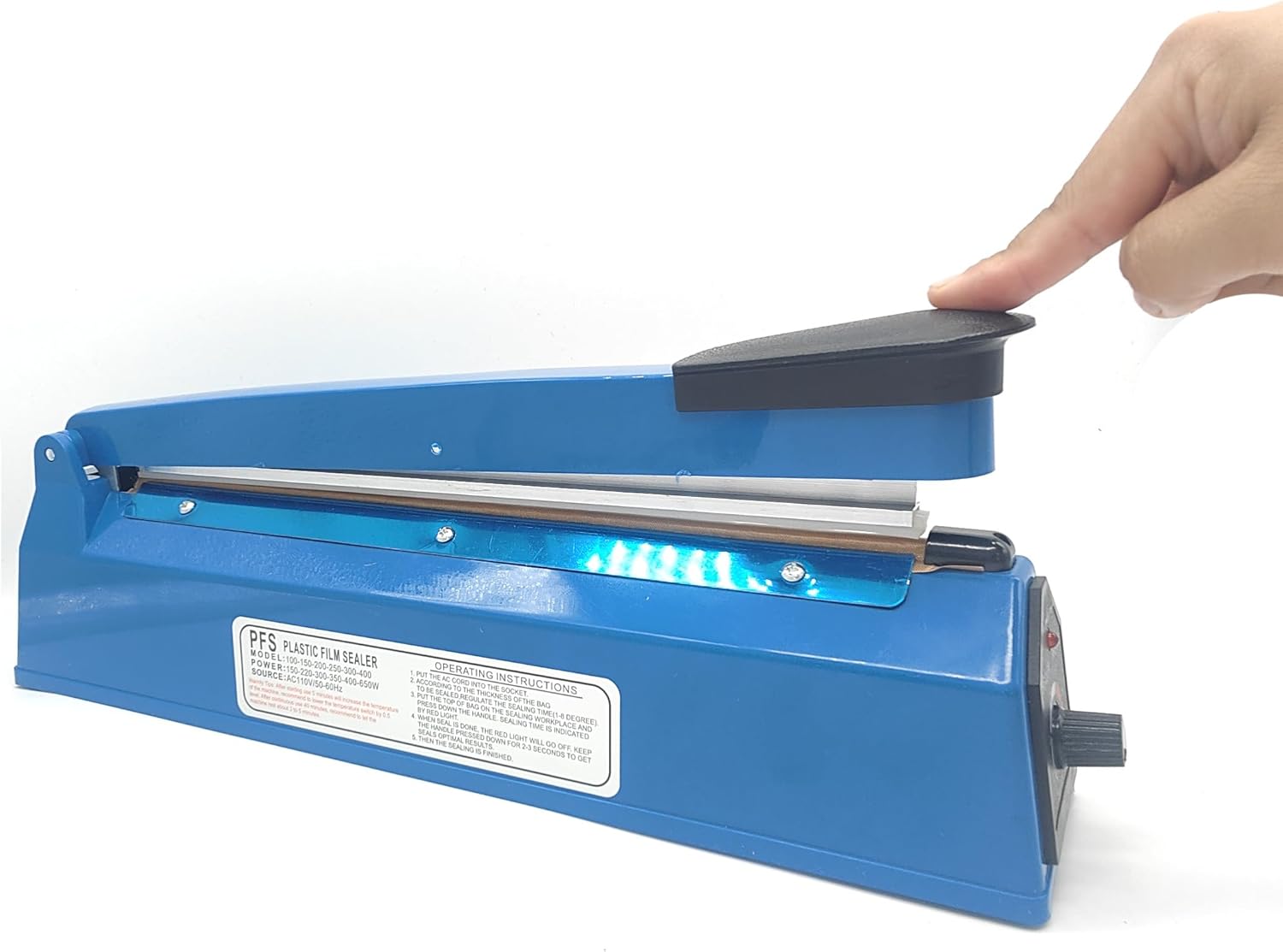 Quick and Simple Operation: The hand press sealing machine offers a swift and straightforward sealing process for various packaging types. With just a few simple steps, you can achieve a secure and permanent seal that can only be broken by tearing or cutting, ensuring food stays fresh longer by preventing mold and moisture. Versatile Sealing Capabilities:300mm sealing length, this sealing machine caters to a wide range of packaging sizes. Equipped with silicone pressing strips and high-temperature heating elements, it utilizes the hot-melt principle to create a long-lasting seal. The 8 adjustable heat settings allow for versatility, sealing everything from ordinary plastic bags (2-3 levels) to aluminum foil (5-6 levels) and kraft paper (7-8 levels). Optimal Sealing Efficiency: Designed for ease of use, the machine requires minimal effort to operate. Simply connect to a power source, select the appropriate heat setting based on the packaging material, place the bag on the heating strip, and press for 2-3 seconds to achieve a perfect seal. Reliable Performance and Durability: With a rated power of 50/60Hz and a voltage of 110v, this hand press sealing machine delivers consistent performance. It boasts a wide sealing width of 2mm and lengths of 30mm, making it suitable for various sealing needs. The silicone pressing strips are both durable and heat-resistant, while the aluminum alloy handle ensures resilience and shape retention over time. Safety Features and Customization: Equipped with a temperature adjustment button, the sealing machine allows for customized sealing based on individual requirements. Additionally, it incorporates an automatic power-off protection feature, where the machine remains in an off state until activated by pressing during use. This ensures safe operation and prevents accidental heating, further enhancing user safety and convenience.