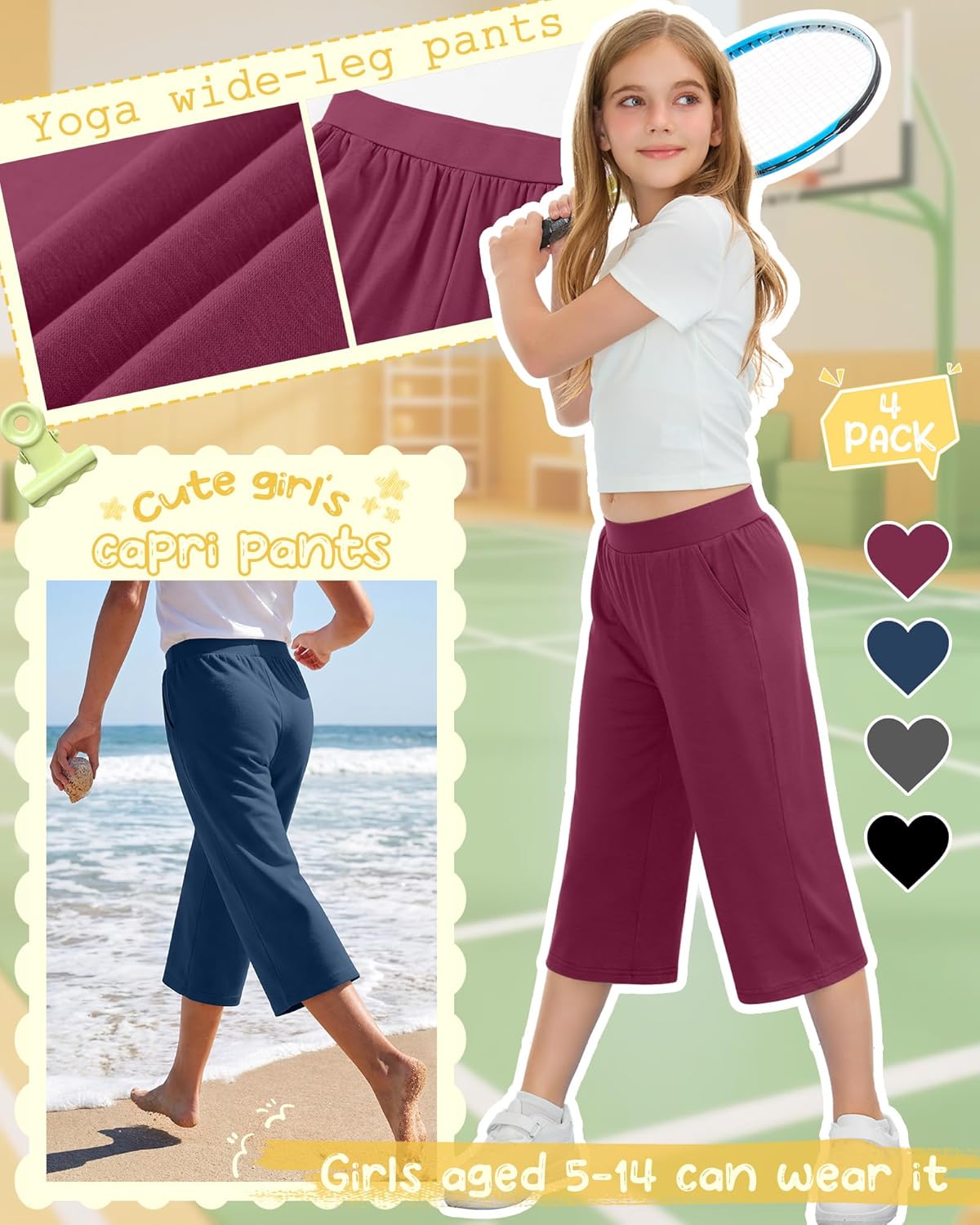 Features: Ideal for kids: Our girls' elastic waist capri pants come with pockets for storing small items and are suitable for various occasions, including casual wear at home, outings, and playtime. Easy care: Washer and dryer safe. Recommend to wash in cold water and tumble dry low or line dry. Specifications: Material: 60% Polyester, 35% Rayon, 5% Spandex Package Includes: 4 x Yoga capri pants for girls Notes: Manual measurement, please allow slight errors on size. The color may exist a slight difference due to different screen displays Please do not wash our products with other clothes, and bleaching is not allowed