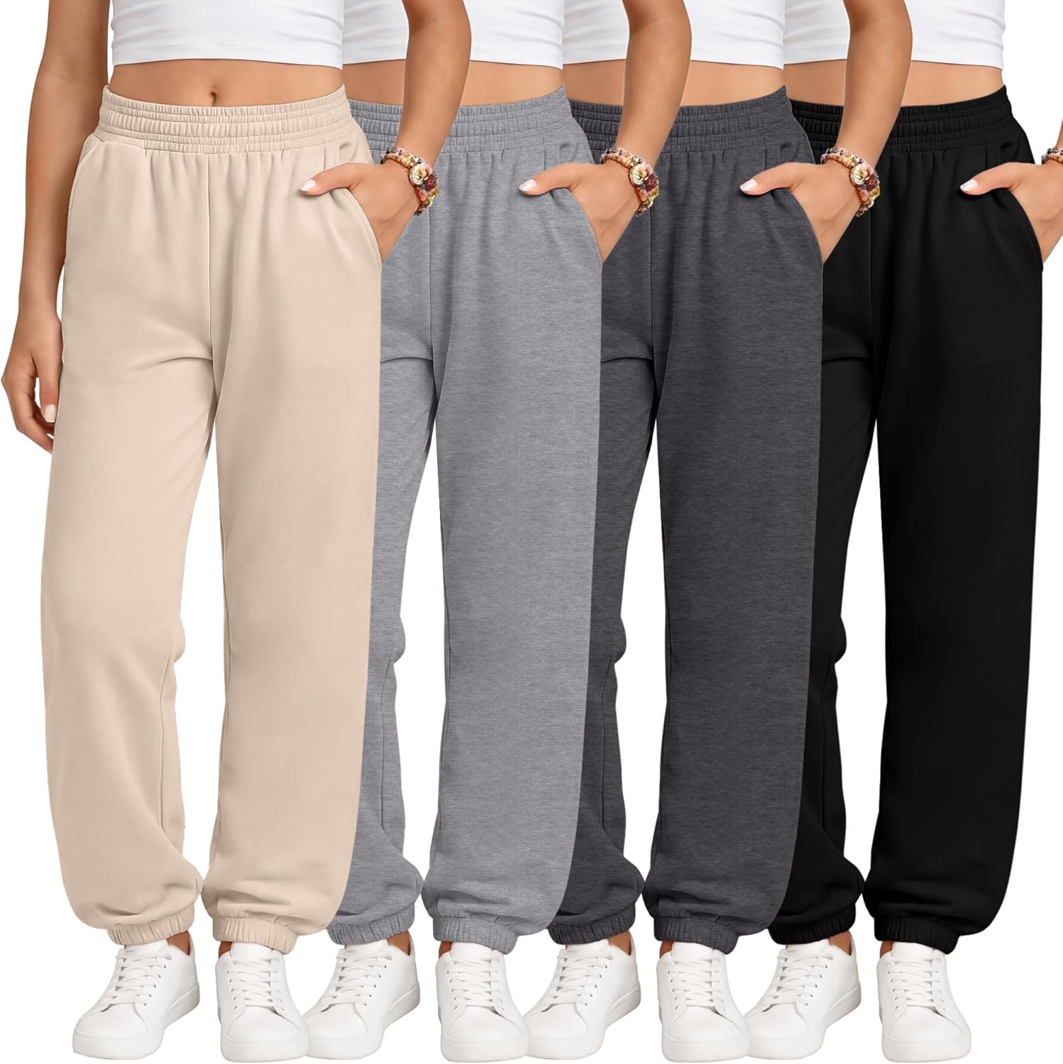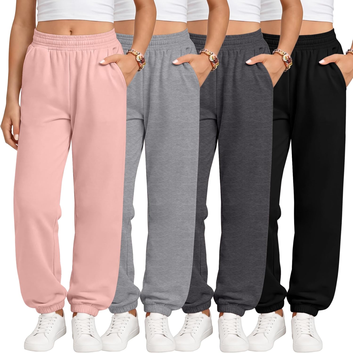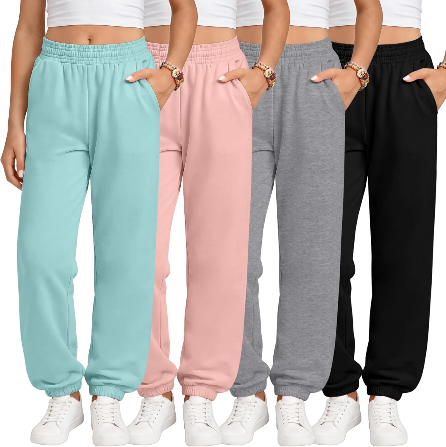 Available in multiple classic colors, these girls athletic joggers are easy to mix and match with crop tops, basic T-shirts, hoodies, light jackets, or sneakers. Whether for everyday casual wear, active sports, or lounging, these jogger sweatpants are a must-have staple in every girl's wardrobe. These girls lightweight jogger pants 4 pack are designed for comfort, flexibility, and everyday wear. Made from a soft polyester-spandex blend, they offer breathable comfort with just the right amount of stretch, making them ideal girls' sweatpants for spring, summer, fall, or winter Tips: The kids' clothes are designed for girls aged 5-14. Please refer to the size chart to select the most suitable size for your child. The garment is machine washable and easy to care for. It is recommended to wash with the same color Material: 95% Polyester, 5% Spandex Size: 5-14Y Season: Spring, Summer, Fall, Winter Remarks: Manual measurement, please allow slight errors in size. Colors may vary slightly due to different screen displays