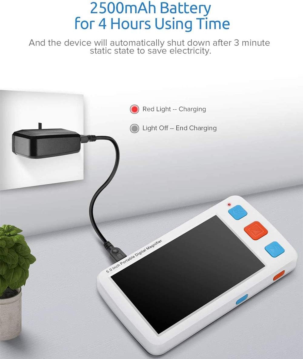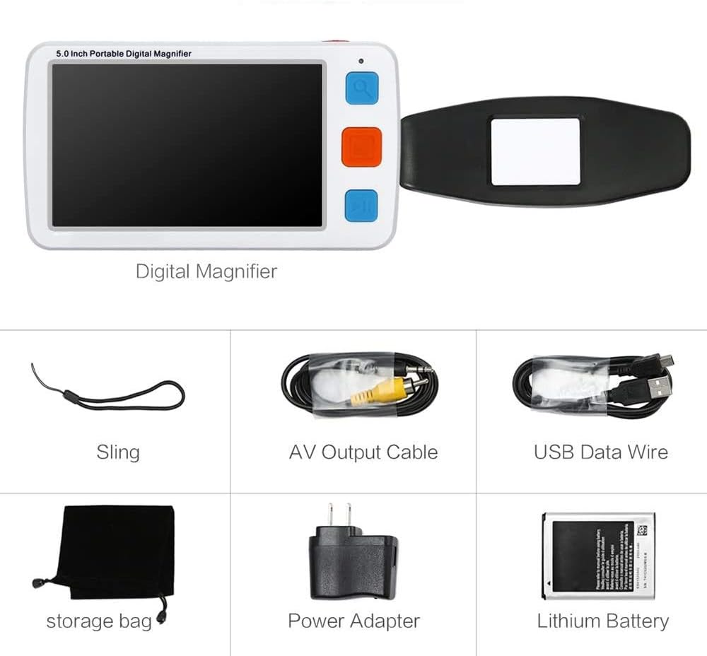 Specification:1. Type of display screen: 5.0-inch high-definition LCD display screen.2. Magnification times: 4-32 times, stepless zoom.3. Size in pixels: VGA.4. Five levels for the brightness of LCD display.5. Focal length of lens: 3.5cm-6cm.6. 17 color patterns for the different requirements.7. Video Interface (AV OUT).8. Mini USB Wire (port 2.0).9. Turn on/off the alarm of buzzer.10. Foldable handle.11. Memory function, capabilities of memorizing the habits of users before the shutdown.12. Available to TF card (32 GB to the maximum) for photographing or replaying.13. Continuous working 4+hours, charging time of 5-6 hours.14. Battery: external battery 2,500mAH (detachable).15. Weight: 230g
