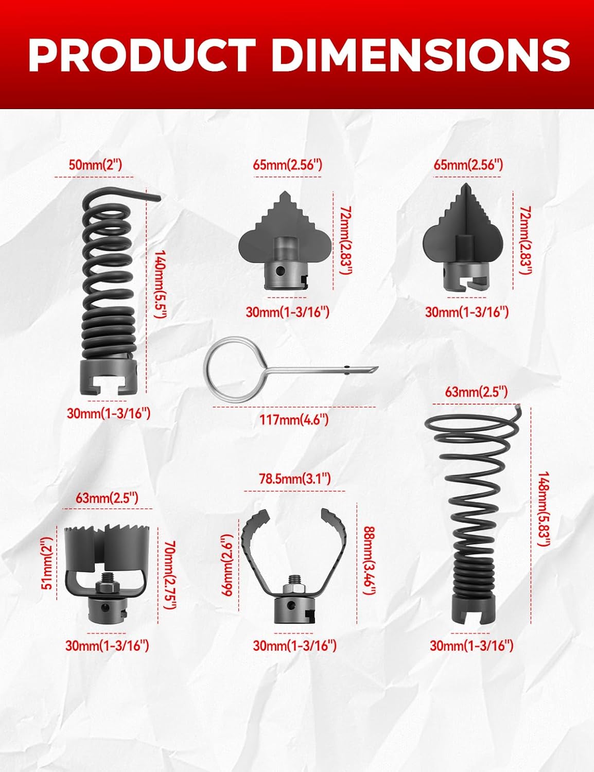 6PCS 30mm Drain Cleaning Attachment Set Fitment: Fit for K-60SP/ K-60SE/ K-750/ RID-GID C-7 C-8 C-8IC C-9 C-10 C-10IC cables Fit for cables with 5/8" to 7/8" Fit for K-1500, K-1800, K-3800 machines Note: Not fit for 5/16"-3/8" cables Service: If you have any questions or concerns about the product, please contact us by email. We focus on providing you the most professional and satisfying solutions!
