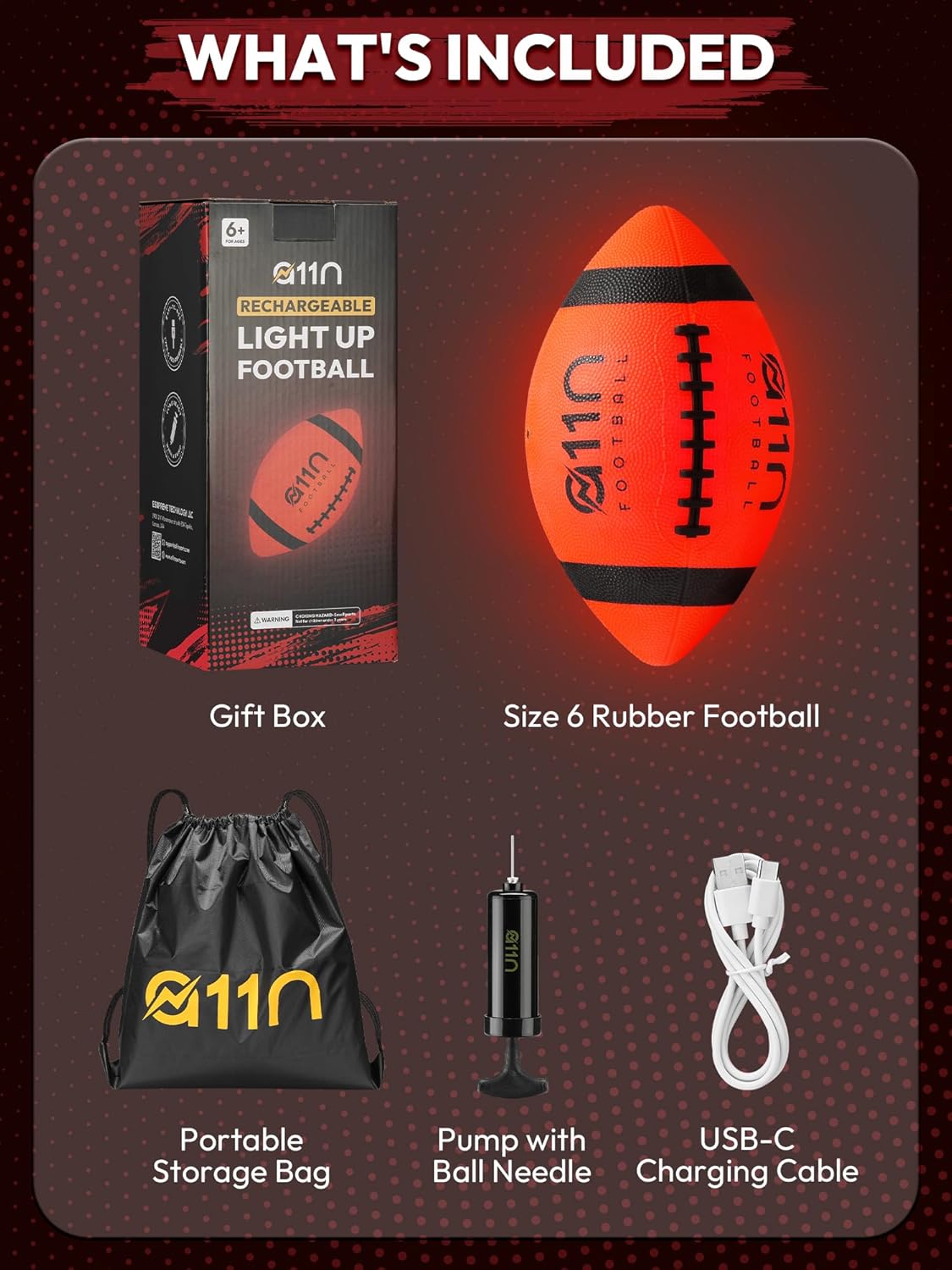 | Included Components | Carry Bag, Gift Box, LED Football, Pump, USB-C Charging Cable |