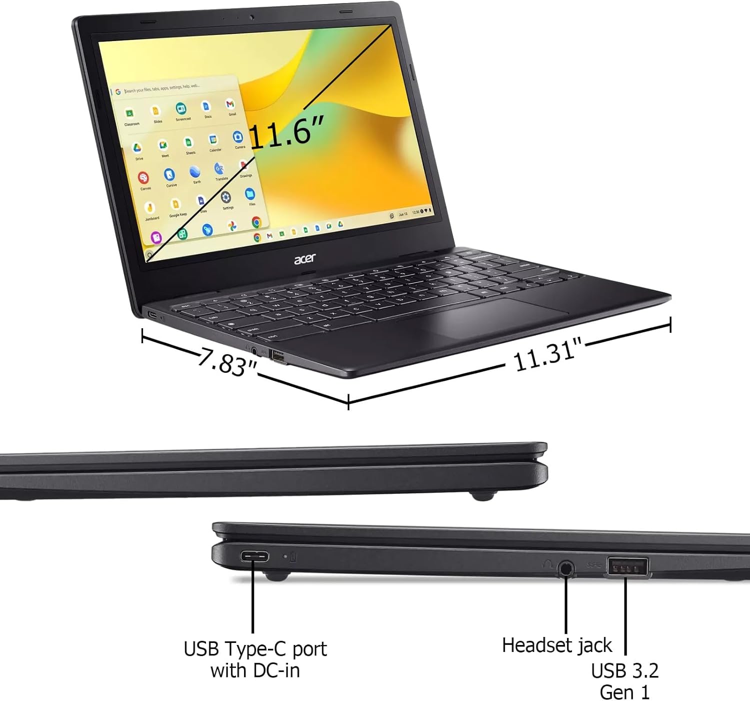 Designed to keep you productive and entertained from anywhere, this black Acer Laptop combines long-lasting battery life with a thin and portable design. Whether you're taking video calls, playing games, or reading the news, the display lets you see and do more.The Intel processor is powerful enough for your busiest days, with a storage for quick bootup and speedy overall experience.Fast boot times, ease of use, tough security & a long battery life are some of the advantages of Chrome OS. With a boot time of about 8 seconds, youll start working quicker; the simplified interface makes it easy to learn; integrated malware protection stops viruses in their tracks.Brand: AcerOperating System: Chrome OSProcessor Brand: IntelProcessor: Intel Celeron N4500 (Up to 2.80 GHz, 4 MB L3 Cache, 2 cores, 2 threads)Graphics: Intel UHD GraphicsGraphics Type: IntegratedGraphics Brand: IntelDisplay: 11.6" HD (1366 x 768) Acer ComfyView TN 60Hz DisplayMemory: 4GB LPDDR4X RAMHard Drive: 64GB eMMCWireless Connectivity: Wi-Fi and BluetoothKeyboard: English, Chrome OS Keyboard with TouchpadWebcam: HD Webcam (1280 x 720)Audio: HD Audio with stereo speakersPorts & Slots:1 x USB-C 3.21 x USB-A 3.11 x Headset JackColor: Star BlackDimensions: 11.31" W x 7.83" L x 0.71" HWeight: 2.65 pounds