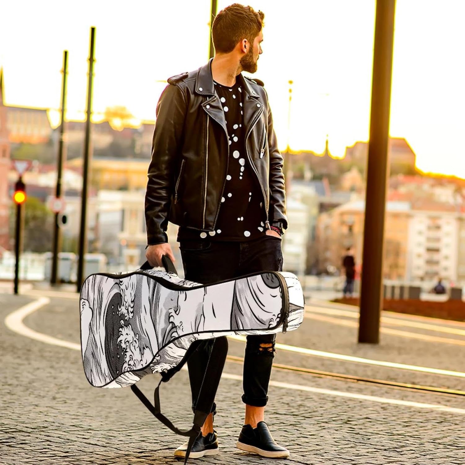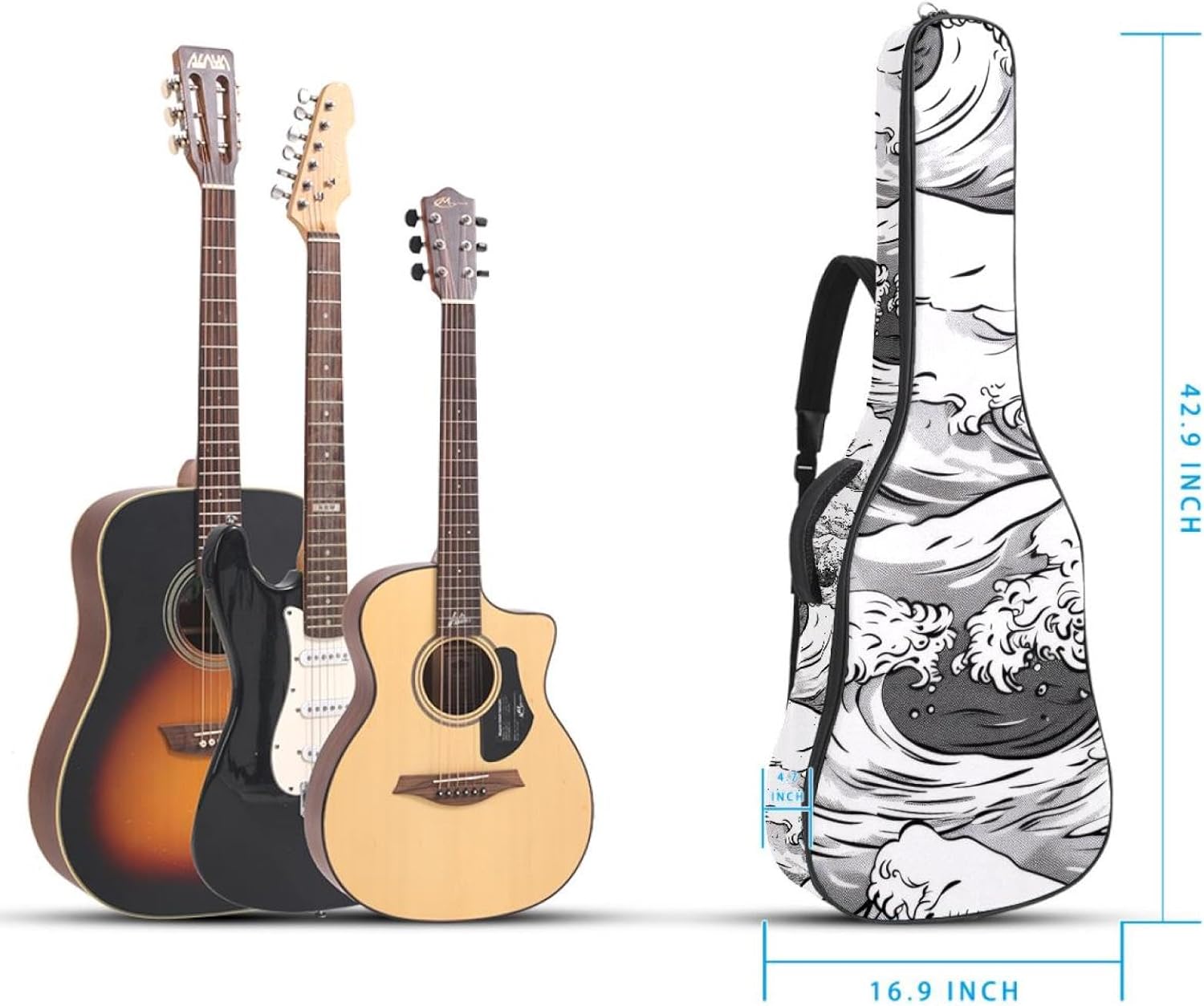 Specifications:Material: waterproof Oxford and waterproof zipper;Size: 42.9’’ x 16.9’’ x 4.7’’, perfect for 40'' 41'' 42'' guitar;Weight:36oz/1020g, lightweight;Color: Multi-color.Features:1. Adjustable backpack shoulder straps and padded side carry handle for more pleasant carrying choices.2. 10mm thick sponge padding inside provide protection for your musical instrument; and fixed Velcro above neck and body keep your acoustic guitar bag safer.3. This guitar bag comes with back hanger loop can be hung on the wall. Save more space when not in use.4. Two pockets for storage convenience, 1 large capacity pocket on outside back and 1 small pocket on the inside neck.5. Cute printed guitar gig bag guitar case backpack, ideal as a gift for your relatives or friends who love music when birthday, Thanksgiving, Christmas, holidays, and other special events.