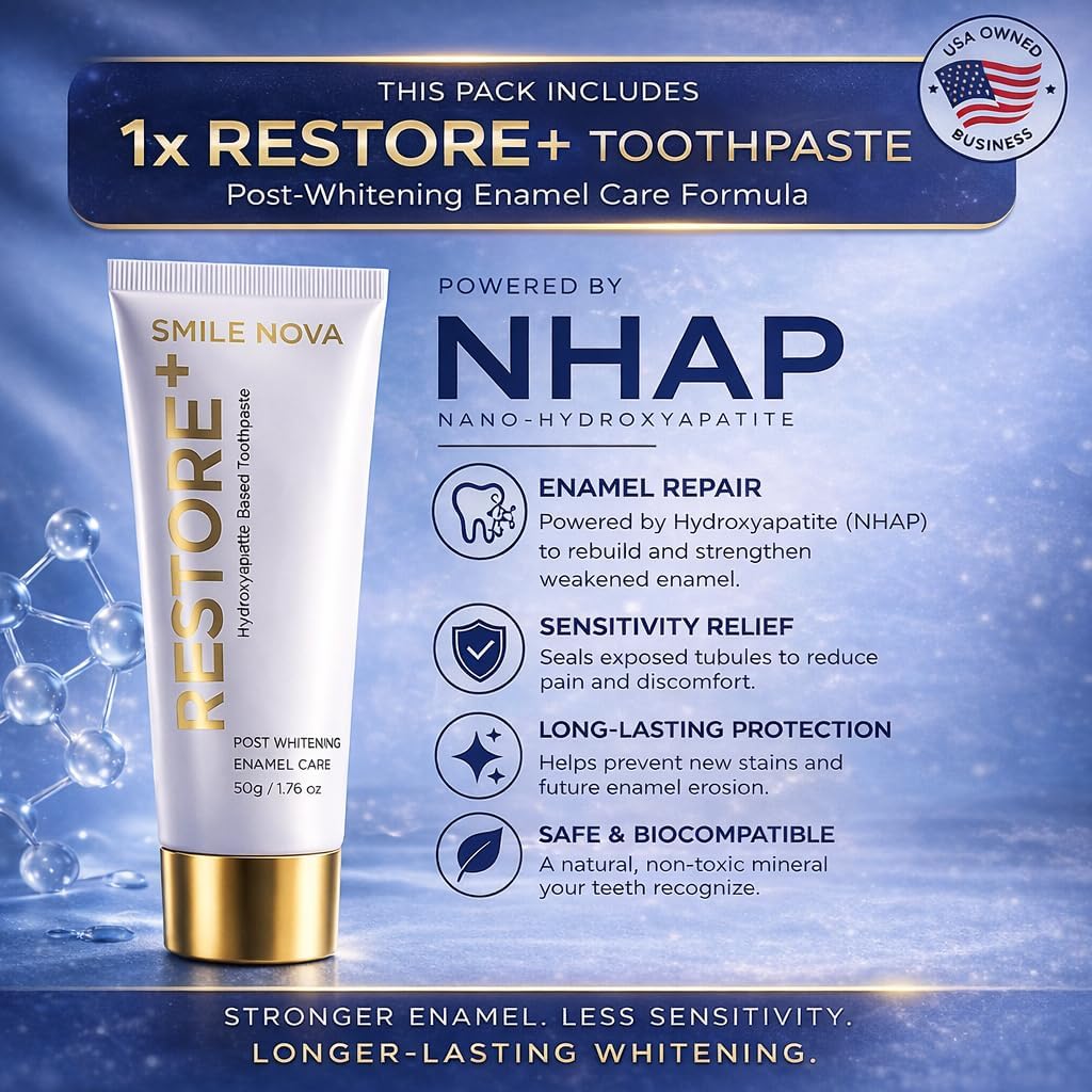 Smile Nova Advanced White delivers professional-level whitening at home without the gimmicks. Powered by 35% carbamide peroxide, it lifts deep stains from coffee, wine, and ageing to reveal a visibly brighter smile in less than 7 days. Each kit includes 3 × 10 mL whitening gel syringes (over three times more gel than standard refills) plus Restore+ Toothpaste, a nano-hydroxyapatite enamel care formula that helps rebuild enamel, reduce sensitivity, and lock in whitening results. Designed for users who already have whitening trays, Advanced White is the perfect refill pack for long-lasting results and healthier-looking teeth. Smile Nova — Professional Whitening. Everyday Confidence.