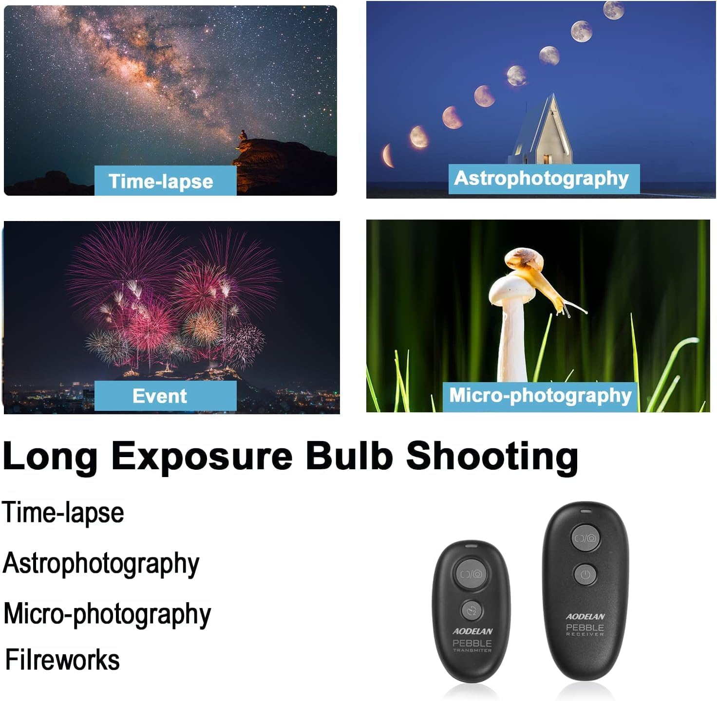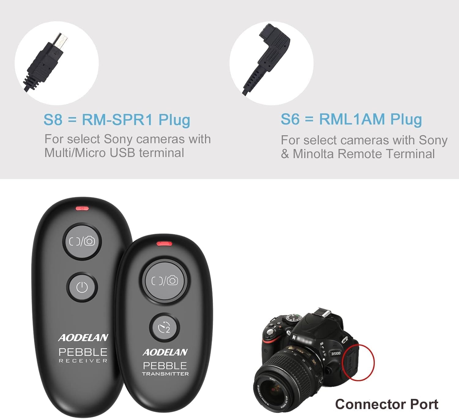 Features: The transmitter can control the receiver wirelessly to perform autofocus, single shot, delayed release of 3s, continuous release and long exposure (BULB); The receiver can also be used as a wired shutter remote to do auto-focus, single shot, continuous release(bulb). Shutter button on Transmitter and Receiver: Half press to auto-focus, fully press to take photo. Specification: System mode: 2.4GHz wireless control system Transmission distance: over 80m) Transmitter Dimension: L 67mm X W 36mm X H13mm Receiver Dimension: L 90mm X W 41mm X H32mm Weight: Transmitter 13g; receiver 37gexcluding batteries Box Contains: 1 X wireless shutter remote release control transmitter 1 X wireless shutter remote release control receiver 1 X CR 2032 Battery for transmitter 2 X Connecting cord 2 X Lanyard sling Please note: AAA batteries are not included.