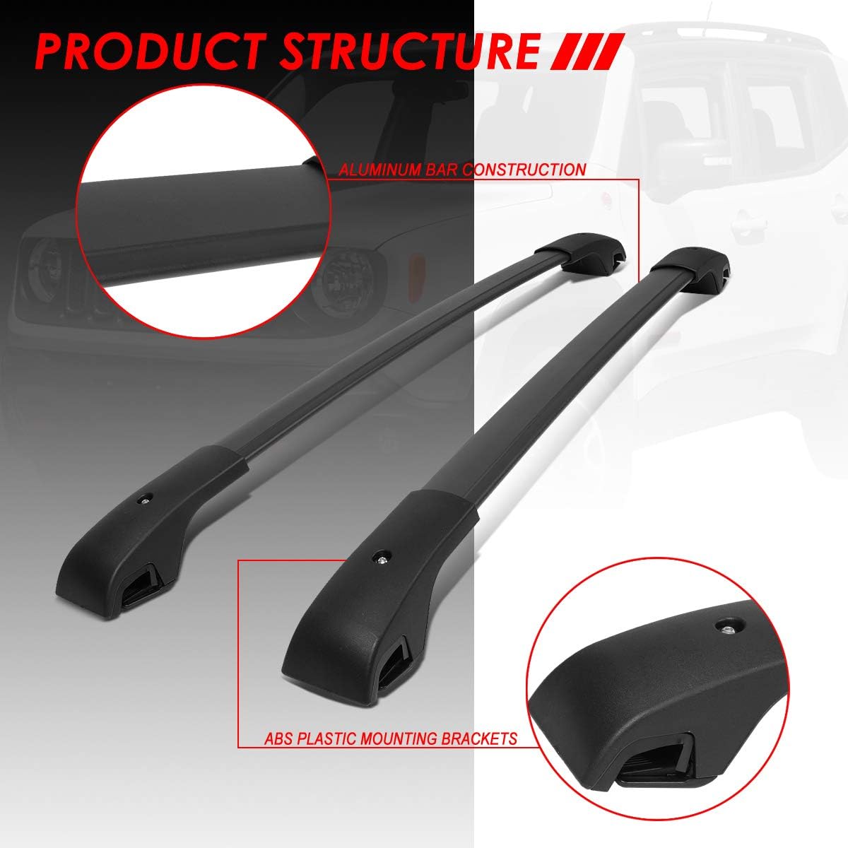 Increase your vehicles storage by installing a set of Cross Bars. Lightweight, and built of high quality materials, these bars will bolt on with no modifications to your vehicles Oem mounting points. Will allow you to securely store and transport bulky items on your roof.Package Included:4 X ABS Plastic Mounting Brackets2 X Aluminum Cross BarsMounting Hardware as ShownThis product is compatible with:2015-2024 Jeep Renegade Cross Bar Mounts onto OEM Roof Rails