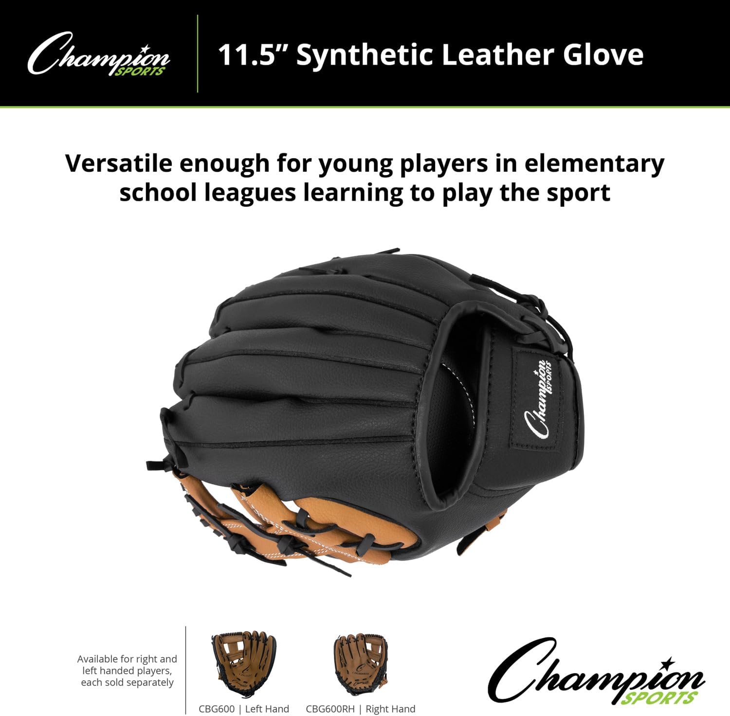 The Champion Sports 11.5" Synthetic Leather Baseball/Softball Glove is ideal for young players learning the game in elementary school leagues. The double bar open web and conventional back design offer versatility, allowing young players to play any position and experience all aspects of the sport. This glove is comfortable, durable, and the non-slip synthetic leather ensures a great playing experience in all conditions. Note: Left-handed glove worn on left hand - throws with right, and Right-handed glove worn on right hand - throws with left.