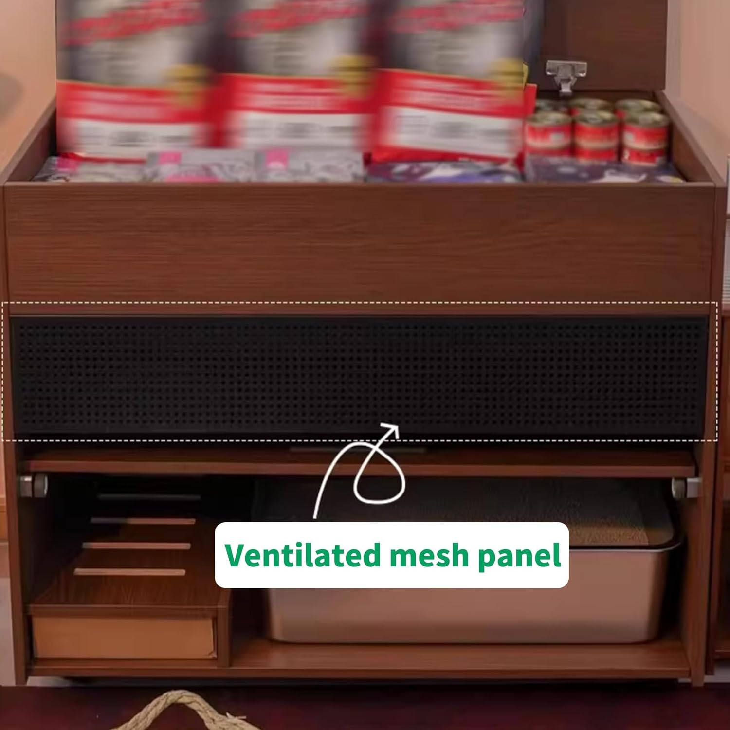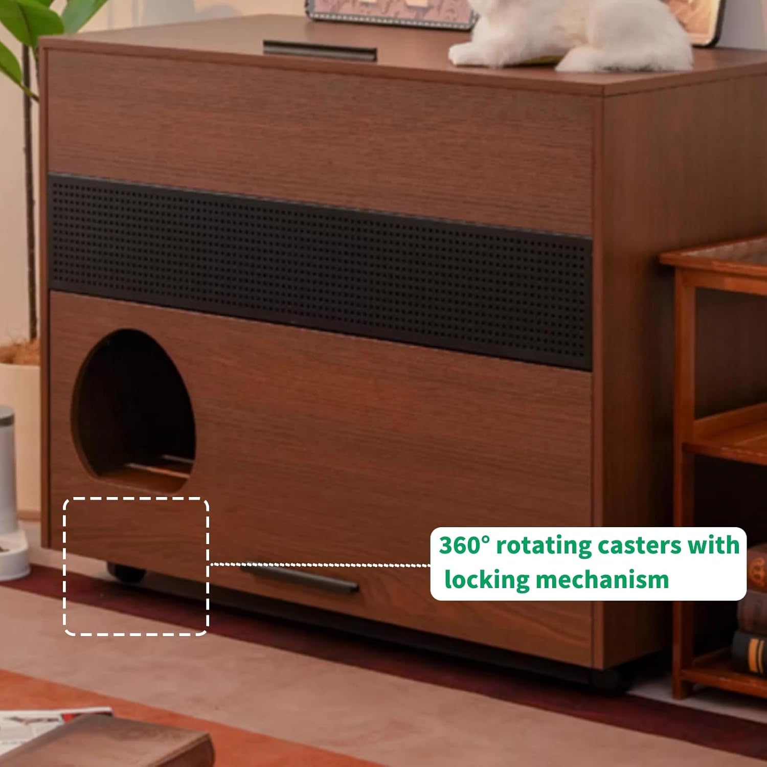 • 360° Rotating Swivel Casters: The enclosed hidden litter box is equipped with 4 casters; built-in bottom wheels allow for smooth movement, making cleaning or repositioning easy, and the locking function helps keep the unit stable after placement