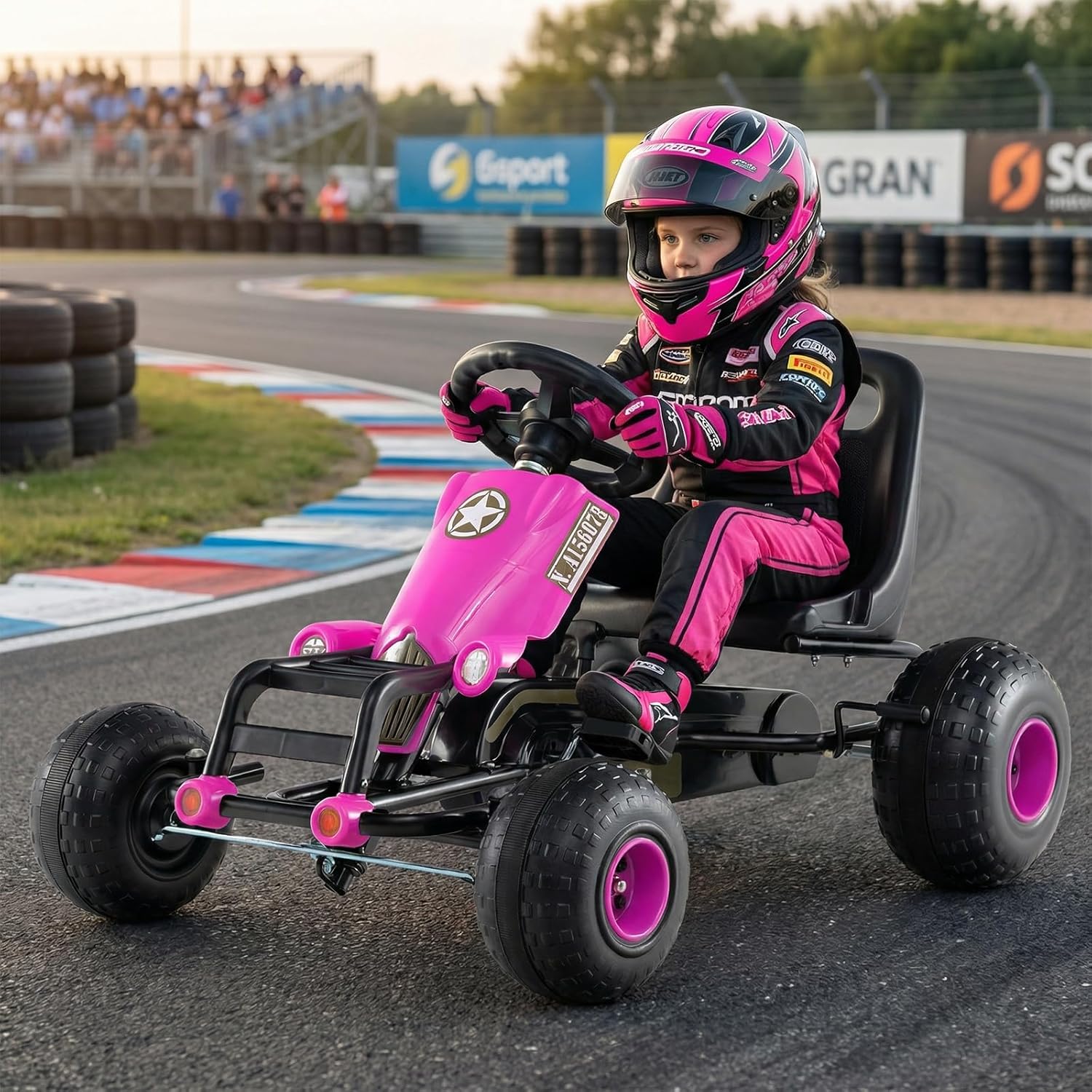 Product DescriptionLet’s go! Hold the steering wheel, step the pedals, and experience the unmatched ride with the kids pedal go cart designed for fun, safety, and comfort!This pedal vehicle delivers a smooth all-terrain ride across grass, gravel, and rough driveways, turning little foot power into fast, exciting adventures.Features:25° limited left & right steering and side hand brake for easy operationEasily go forward and back with anti-skid pedalsShift lever for easy switch between pedal and free-wheel clutchThe pedals will not rotate with the wheels for a slope under free-wheel clutchPedal to turn, but the wheels will not move for safety when in free-wheel clutchAdjustable ergonomic with 2 adjustable positions for growing kidsHigh back and contoured surface for added comfort4 large textured wheels are suitable for various surfacePedal powered kart for lawn, gravel, asphalt, pavement and concrete roadsSafety comes first with child-friendly detailsFully-enclosed chain guard for safe ridingPlease note:make sure the seat position during assembly and can only be adjusted during installationSpecification:Color: Green/PinkMaterial: PP, MetalOverall Dimensions: 37.5” x 25.5” x 22”/95 x 65 x 56 cm (L x W x H)Seat Size: 12” x 8” x 11”/30 x 20 x 28.5 cm (W x D x H)The Adjustable Seat Range: 1.38''/3.5cmFront Wheel Diameter: 8”/20 cmRear Wheel Diameter: 10”/26 cmSuitable Age: 3+ Years OldSuitable User Height: 39”-61”/100-155 cmWeight Capacity: 77 lbs/35 kgNet Weight: 21 lbs/9.5 kgPackage Includes:1 x Pedal Go Cart1 x User Manual