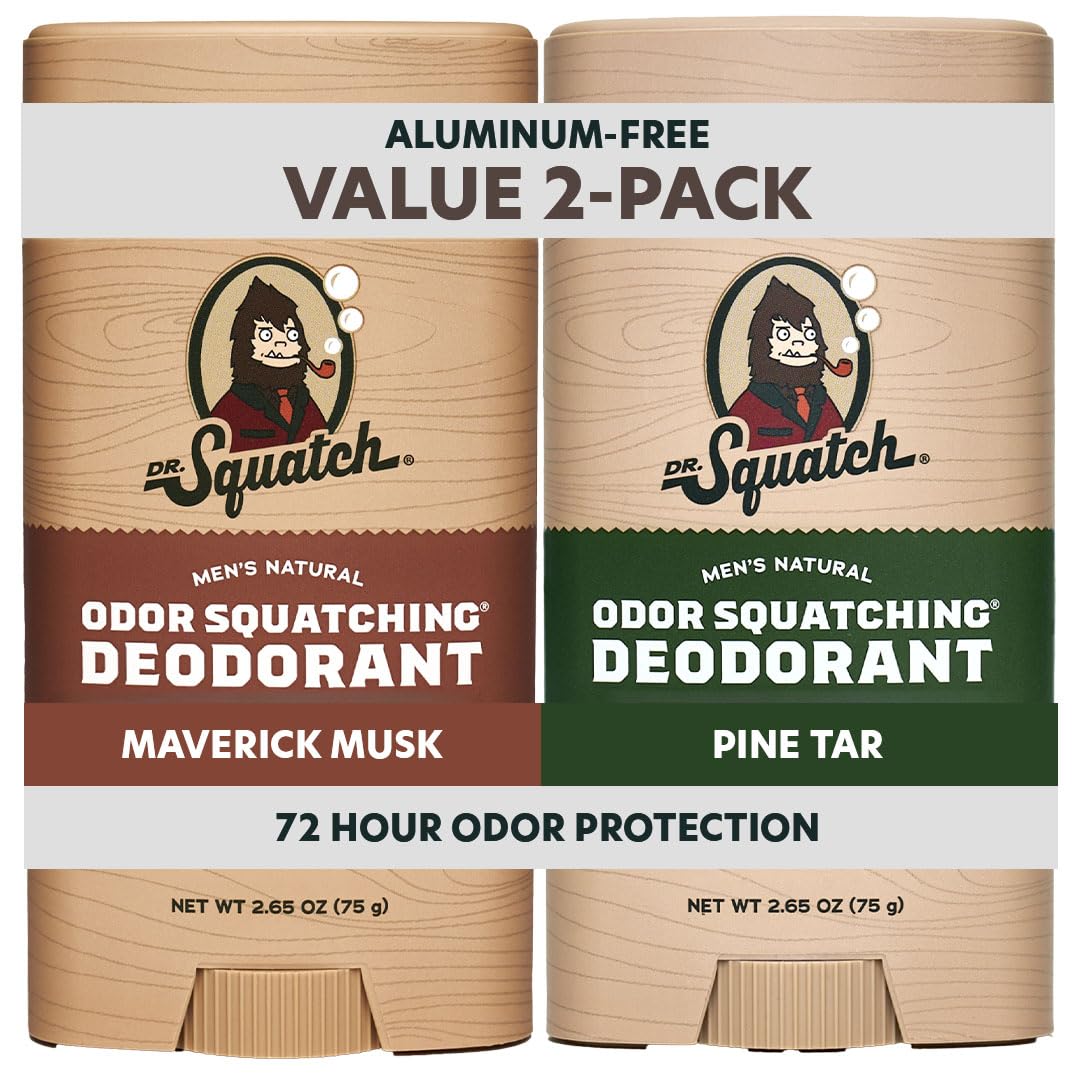Dr. Squatch Natural Deodorant for Men fights odor with our Odor-Squatching formula, featuring Arrowroot Powder, Charcoal, and Postbiotics for all-day freshness. This aluminum-free deodorant comes in two refreshing scents—Mountain Meadow and Lumberjack Lodge—delivering rugged, natural protection without harsh chemicals. Made for men who want powerful performance and clean ingredients, it keeps you feeling confident from morning to night.