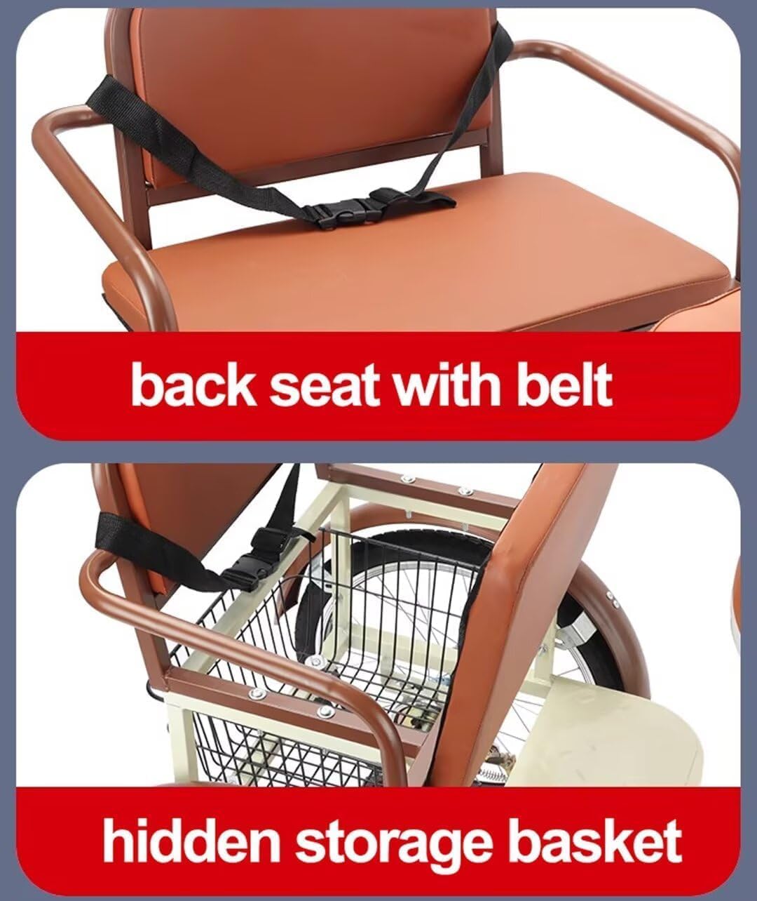 Specification:Name:Tricycle RickshawSuit User:Senior,Adult,ElderlyMax Load:150KgSuit Body Height:150-180CmColor:Wine Red,Beige,RedPackage:1Xdisassembled Tricycle(Need You to Assemble)Material:1.High Carbon Steel Frame2.Pu Leather Wrapped Sponge Seat3.Rubber Grip4.Aluminum Alloy Rim Spoke WheelButyl Rubber Inner Tube + Rubber Anti-Skid Outer Tire6.Pvc PedalsSize:20InchTotal Length:175CmRear Wheelbase:65CmHandlebar from Ground:95-105CmSaddle from Ground:75-85CmWheel Diameter:48CmBottom Basket from Ground:63CmBack Seat:Wide 58CmFeatures:the Pedal Tricycle is Mainly Used for Daily Hanging Out.Dual Brakes, and Handlebar with Anti-Slip Parking Lever Lock.Large and Soft Sponge Back Seat with Backrest and Belt is Comfortable to Ride.Lift up the Seat and a Hidden Storage Basket at the Bottom, Which Can Be Used to Carry Daily Necessities Such As Vegetables and Fruits.the Front Wheel is Equipped with a Hydraulic Shock-Absorbing Front Fork to Alleviate the Impact on Bumpy Roads.6.The Frame Has Aluminum Alloy Folding Buckles for Quick Folding; It is 90% Pre-Assembled Upon Arrival and Easy to Install.