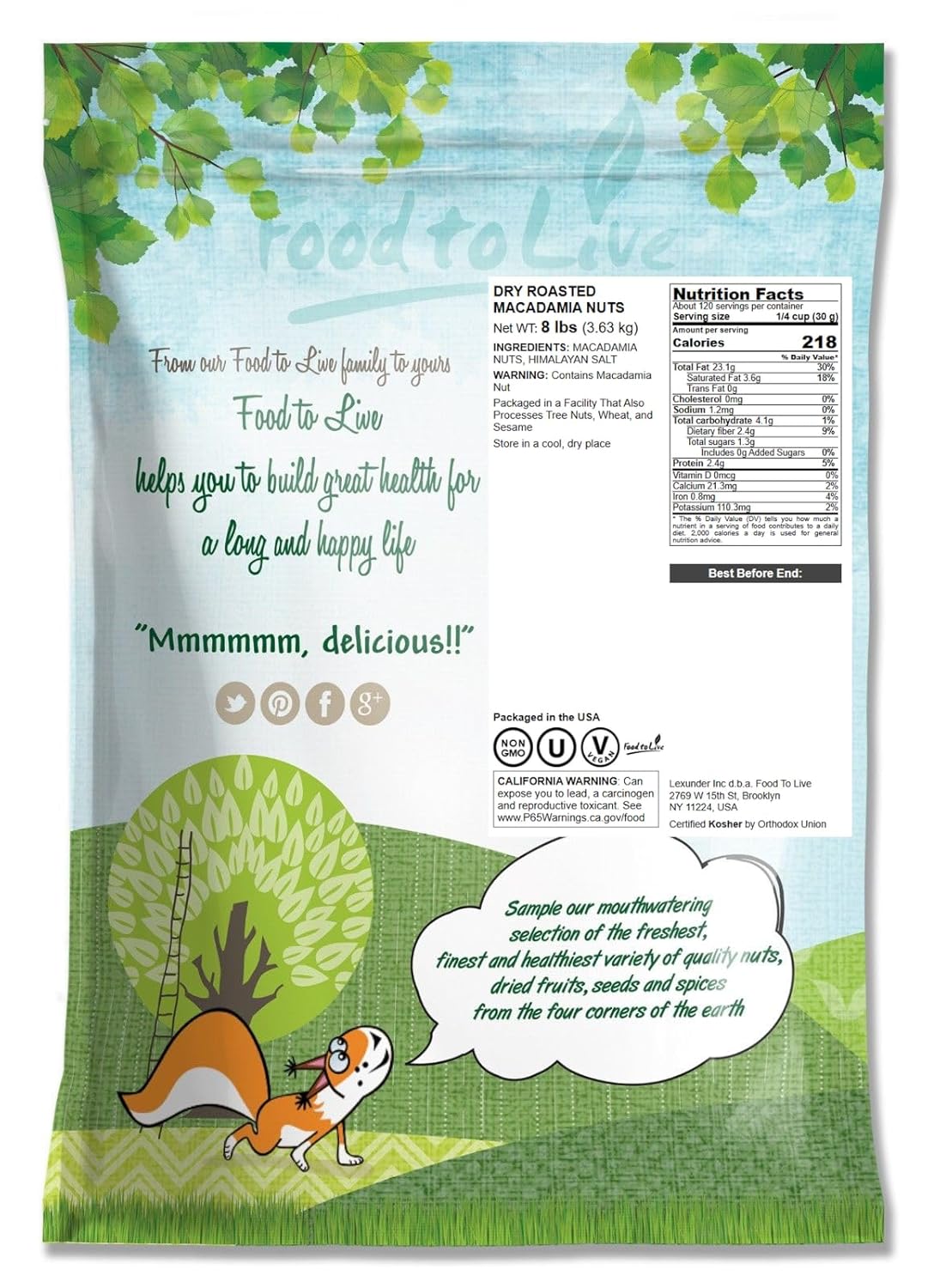 The Macadamia Nut, hailed as the “queen of the nuts,” originated in beautiful Australia. Due to its distinctive buttery flavor and refined texture, it is a popular delicacy for special events. At Food to Live, our Macadamia Nuts undergo a unique preparation process, where they are initially dry roasted in the oven in small portions, to ensure every nut is equally exposed to heat. We add no oil or salt, we simply – roast. This approach gives the nuts a crisp texture and a sweet and savory taste without compromising their nutritional value. Our oven-roasted Macadamias are a part of Food to Live's Signature Snacks Collection, developed and created by our Chef Lana. Nutritional Profile Despite the widespread notion that Raw Macadamia Nuts are more nutrient-dense than Roasted Macadamia Nuts, we beg to differ. Low-temperature roasting and oil-free techniques simply reduce the moisture content in the nuts, while preserving most of their nutrients. Our Dry Roasted Macadamia Nuts are still rich in essential vitamins, including A and B, as well as minerals like Manganese, Thiamine, Copper, and Iron. Additionally, they contain an abundant amount of dietary fiber, protein, powerful antioxidants, and unsaturated fats. Ways to Enjoy Organic Roasted and Unsalted Macadamias The culinary uses of Toasted and Unsalted Macadamia Nuts are diverse, as they can serve as an ideal on-the-go snack or a great addition to salads, stir-fries, eggs, avocado toast, or baked fish. They are also an excellent ingredient for macadamia nut cookies, cakes, waffles, and other baked goods. You can even try the famous chocolate-covered macadamia recipe or blend them into a delicious macadamia nut butter. How to store To extend the shelf life of your Roasted Macadamia Nuts bulk, store them in the freezer, while keeping smaller packages in a cool, dry place.