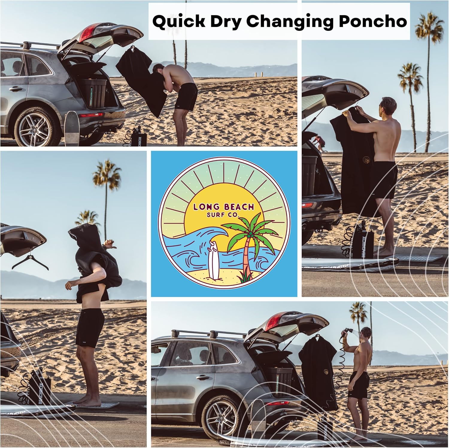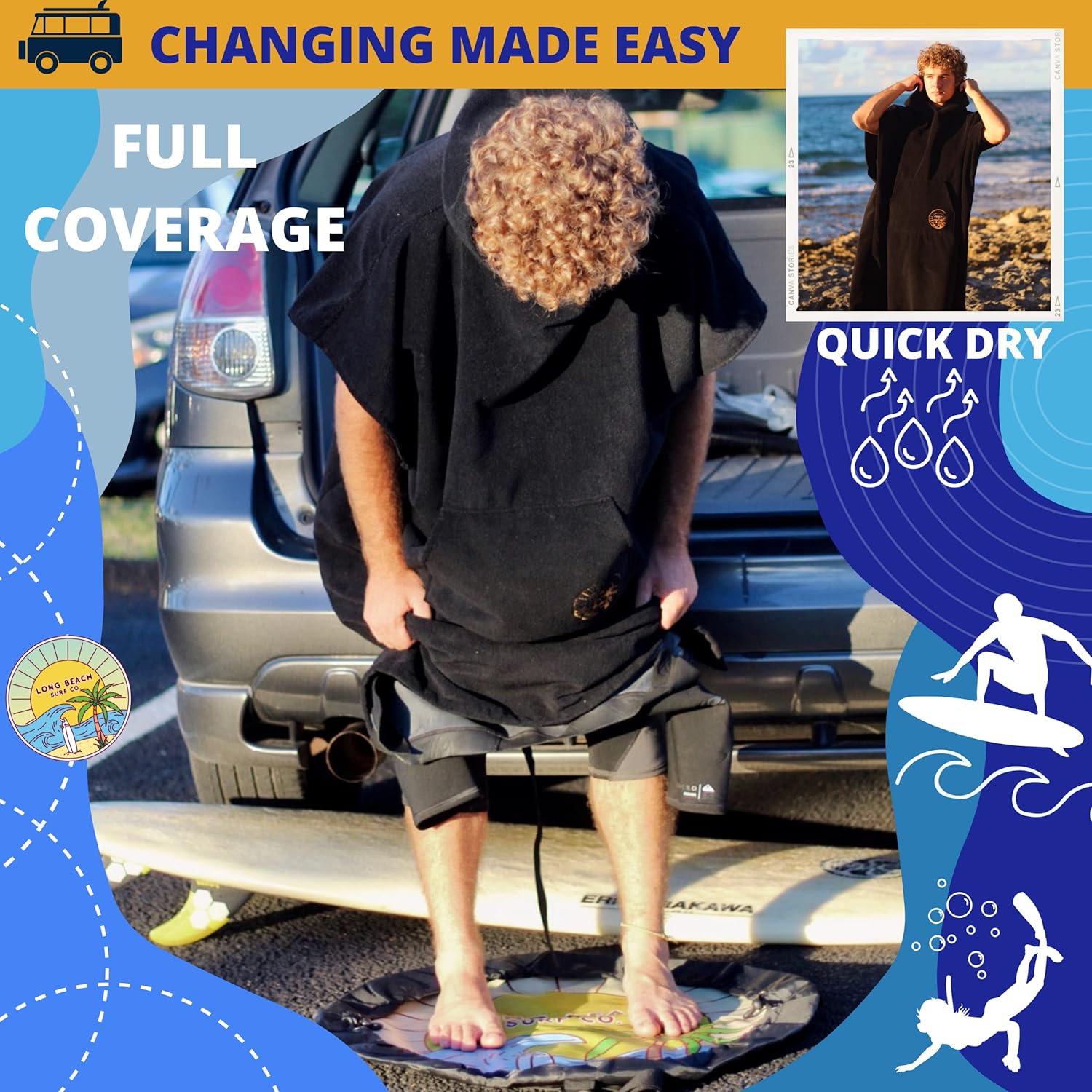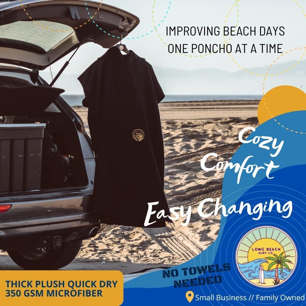 Long Beach Surf Co: Our hooded towel is designed with quality in mind and will outlast any other towel cover ups for women or men. This parka for swimmers will replace their favorite towel pants as a warmer more versatile option for comfort after a day at the pool or the beach. Our swimming towel hoodie is made with 350 GSM microfiber polyester which is a thicker fabric used than what is usually found on a swim robe. The design of this towel robe helps you change out of a wetsuit or swimsuit after surfing or swimming in public when there is no convenient place to change. This hooded beach towel is extra water absorbent, helping your body and hair dry quickly, and doesn't feel heavy after it absorbs water. This surf towel includes a cozy pocket for added storage space to carry surfing accessories, cellphone, wallet, and keys, or just to keep your hands warm. The poncho hoodie blocks out the wind on chilly beach days and dries your hair. Our changing robe for men and women is a game changer for simplifying your beach visits. --- About Us: The Long Beach Surf Company is a female led, family-owned small business. We specialize in products designed by surfers for surfers, but our products are used and loved by all! Our products are versatile and useful for everyone. We love designing beautiful and thoughtful products that make our life, and hopefully your life, a little better! We hope you love our surf poncho beach hoodie. Thanks for helping to support our business.