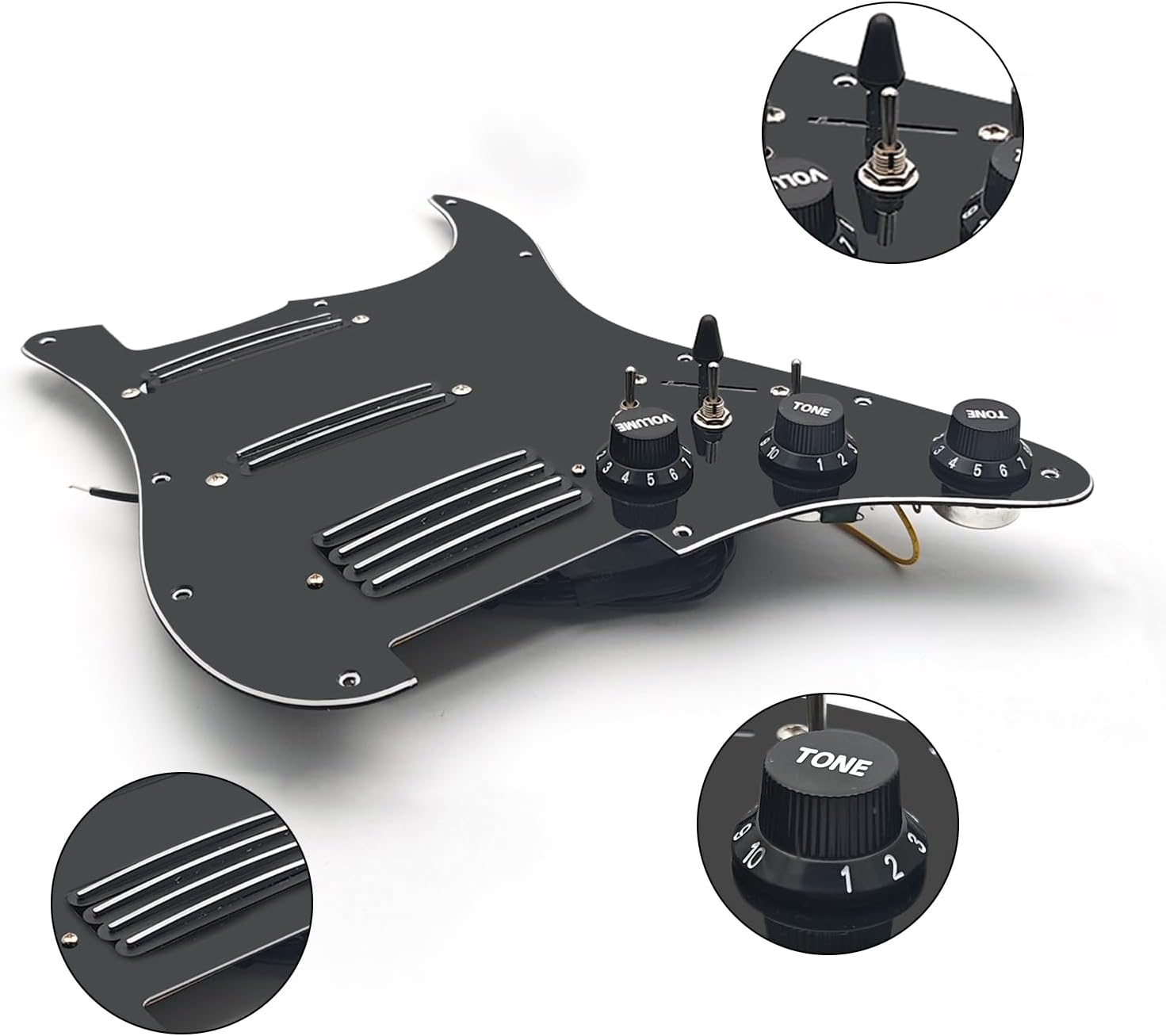 Description:100% Brand new, never usedItem 100% like the picture shownPickguard and Two Mini Humbucker + ONE 4 Coil PickupSwitch is a 5 way switch and the wiring is one volume and two tone controlsWith three 2 way on/on switch, can Coil Split the pickupMagnet: Ceramic. D.C. Resistance: Neck and Middle: 9K (splitting coil 4.5K)Bridge: 18K (splitting coil 9K)Four conductor wires, Black wire is hot, green wire is ground, red and white is for splitting coil11 screw holesAs with any pickguard, some modification may be necessary for exact hole alignment, as there are many different hole patterns.Material: PVC Pickguard and Copper Coil PickupPickguard Colour: 3 ply PVCPackage Include:1 x Guitar Loaded PickguardNote: Due to the difference between different monitors, the picture may not reflect the actual color of the item. Thank you!