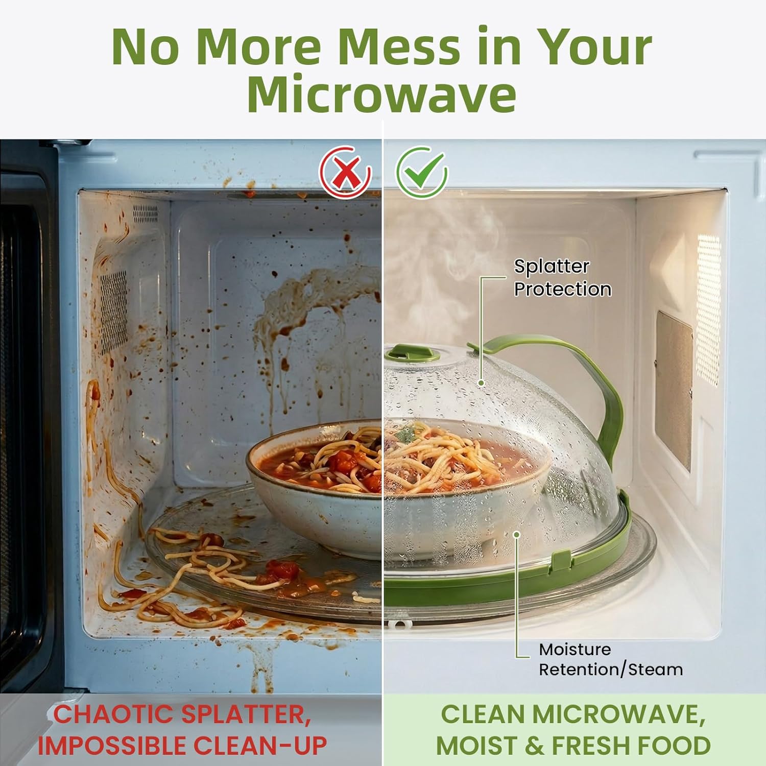 🍽️ Make Everyday Heating Cleaner, Easier, and Better Reheating food in the microwave shouldn’t leave behind splatters or dried-out meals. This microwave splatter cover with steamer is designed as a reliable cover for microwave food, helping keep your appliance clean while reducing mess. Whether you're warming up leftovers or preparing quick meals, this practical solution makes everyday heating cleaner and easier. 💧 Enjoy Moist, Fresh-Tasting Food Every Time Unlike ordinary covers, this microwave food cover with built-in steamer works as a microwave cover with water steamer, allowing you to add water and create gentle steam during heating. This microwave steam cover for food helps prevent dry, rubbery textures—perfect for reheating rice, pasta, vegetables, and more. 🛡️ Full Splatter Protection for a Cleaner Microwave This durable microwave dome splatter cover acts as a dependable microwave splatter guard, fully covering your plate or bowl. It works as an effective splatter cover for microwave, stopping sauce, grease, and food splatter from sticking to the interior—keeping cleanup quick and hassle-free. 🍽️ Designed to Fit Real-Life Meals With a wide 10.2-inch design, this large microwave splatter cover functions as both a microwave plate cover and plate cover for microwave oven, fitting most standard dishes without touching your food. The added height also makes it a tall microwave splatter cover, giving you flexibility for larger portions. 👍 Easy to Use with a Practical, User-Friendly Design The sturdy top handle allows quick and easy lifting, making this microwave cover with handle simple to use. Whether you need a microwave dish cover for reheating food or a convenient everyday food cover microwave, it’s designed for effortless handling. 🧼 Durable & Easy to Clean for Everyday Use Built to withstand repeated heating, this microwave splatter cover maintains its shape and performance over time. The smooth surface resists stains and odors—simply rinse or place it in the dishwasher for quick and easy cleaning. 🏡 Perfect for Everyday Use in Any Kitchen From busy weekday lunches to quick snacks, this versatile microwave cover fits seamlessly into any routine. Also known as a tapa para microondas or tapadera para microondas, it’s a simple, must-have upgrade for keeping your microwave clean and your food tasting better.