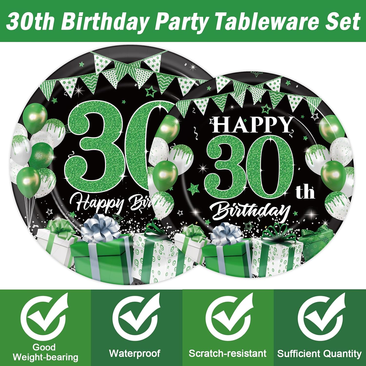| Included Components | 24 x 9inches 30th birthday paper plates 24 x 7inches 30 years old birthday party plates 24 x 6.5inches Birthday party napkins ( 13inches when expending ) 24 x Plastic green forks 24 x Plastic forks |