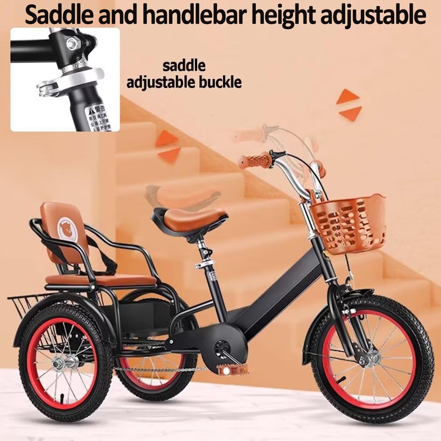 Features:Tandem Tricyclethe Tricycle with Rear Passenger Seat,One Tricycle Can Carry 2 Kids at Same Time.Adjustable Tricyclethe Saddle and Handlebar Can Be Adjusted in Height,Appropriate Adjustments Can Be Made According to the Growth and Development of the Child.Outdoor Cruiser Trikepneumatic Spoke Wheels, Built-In Flexible Bearings, Increased Anti-Slip Friction Particle Tires, Suitable for Riding on Various Roads.Kids Trike with Brakethe Handlebar Grip with Brake Lever,Sensitive Handle Brake Linkage to Front Wheel,Braking in Time.Large Storage Compartmentthe Tricycle with Front Plastic Basket and Rear Steel Basket and Rear Seat Bottom Hidden Compartment.Basic Information:Frame:Carbon SteelHand Grip:RubberWheel:Pneumatic Spoke WheelsSpeed: Single SpeedWheels:3 WheelsBaskets:Front,RearColor:Pink,Red,BlackSize:14Inch,16Inch,18Inch14Inchhandlebar Height 65-75Cm,Car Length 110Cm,Saddle Height 52-59Cm,Wheel Diameter 45Cm;16Inchhandlebar Height 70-79Cm,Car Length 120Cm,Saddle Height 57-64Cm,Wheel Diameter 50Cm;18Inchhandlebar Height 75-85Cm,Car Length 130Cm,Saddle Height 62-69Cm,Wheel Diameter 55Cm;Package:1 X Toddler Tricycle (You Need to Install It Yourself).Note:If There is Any Problem in Assemafter Receiving the Goods, Please Feel Free to Contact Us, We Can Provide You with Guidance.Do Not Use on Public Transport Roads, and Ensure That Children Are Accompanied by Adults When Using It.