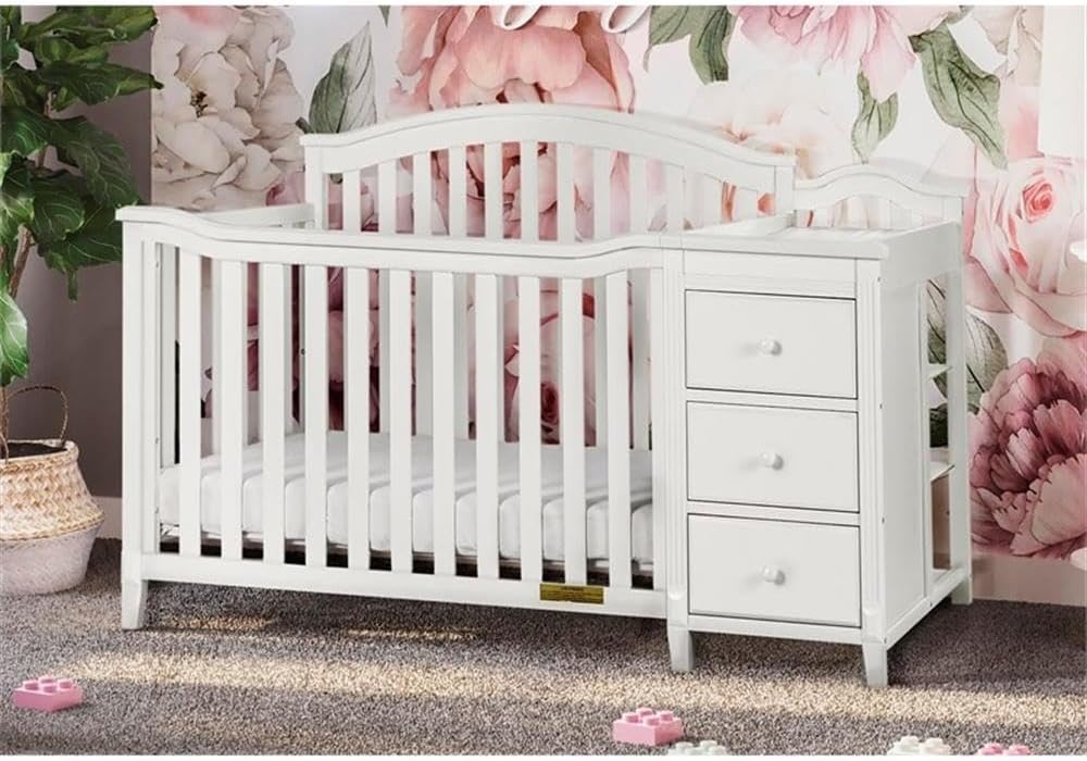 The versatile 4-in-1 Convertible Crib and Changer is perfect for the space-conscious family and is the perfect baby station. It features delicate design elements, including an arched headboard and sloping footboard. The changing table comes equipped with three drawers and three-unit shelves that can later be used as a nightstand/dresser when converted to full-size bed (conversion rails and extra leg parts are not included and sold separately). Its durable, finish makes the crib easy to maintain. The 4-in-1 crib and changer allows you to lay baby down with ease. The mattress support can be adjusted to three different positions. It can convert to toddler bed (toddler guardrail is sold separately), daybed or full-size bed to support a baby’s growth.Features :- Materials: Pine solid wood- Finish: White- Made from sustainable pine wood- 3-level mattress spring adjustment to adapt to the child's growth- Changing pad is included- Changing station features 3 drawers and 3 shelves- Converts to toddler bed (guardrail not included), day bed and full-size bed (conversion rails and extra leg parts are not included and sold separately)- Certified to meet the latest US safety standard- Available color options: Espresso, Gray, WhiteSpecifications :- Product Weight : 96 lbs