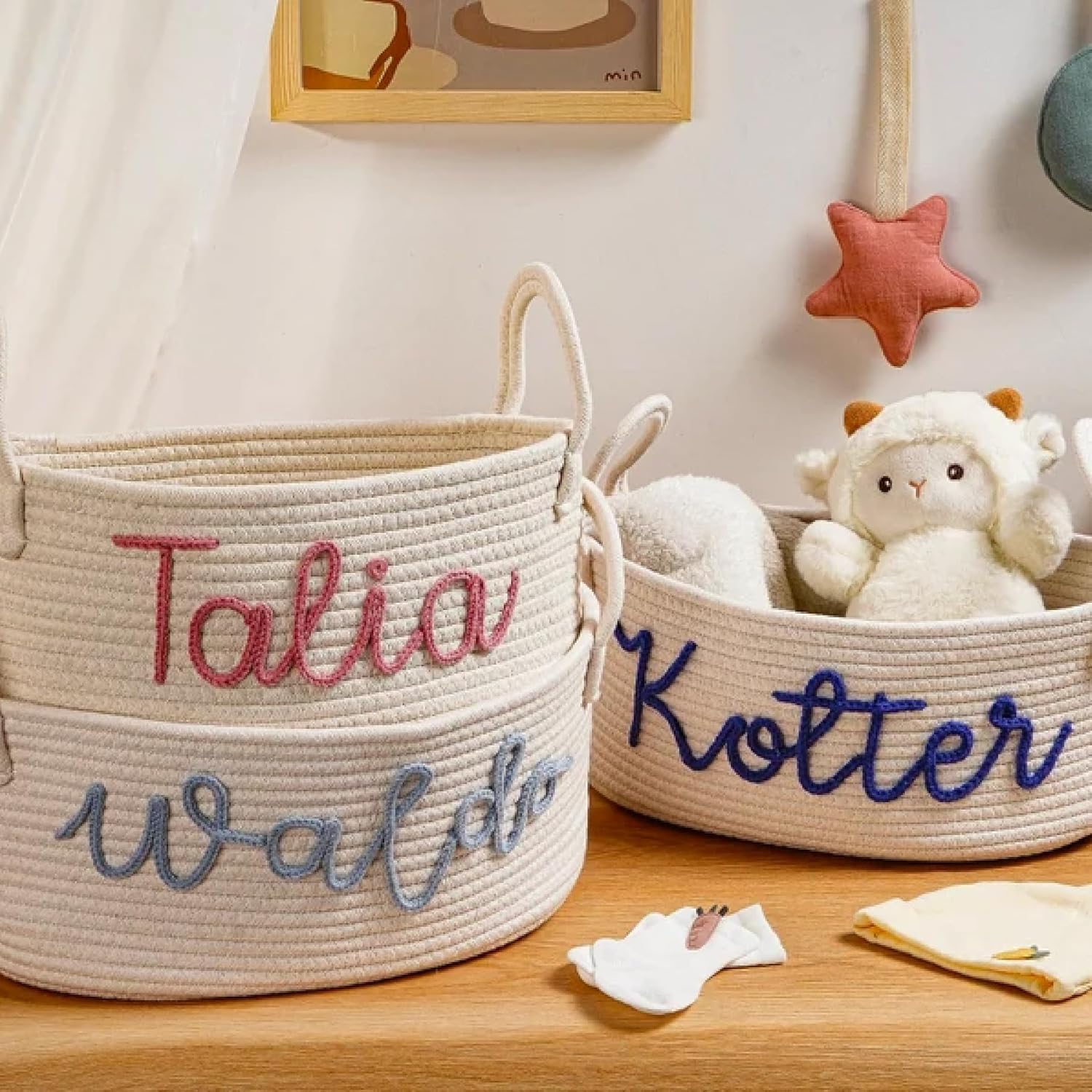 Description: Our custom rope baskets are the perfect for a baby shower gift that can double as storage for a nursery, kid's bedroom, playroom, etc. If you are adding a daisy, the color of the daisy is white and the stamens are yellow. The name is handmade and may be different from the picture. Small - Approximately 12" x 8" x 4.5" (fits up to 7 letters) Medium - Approximately 13" x 9" x 5" (fits up to 8 letters) Large - Approximately 14" x 10" x 6.5" (fits up to 9 letters) Choose a name, monogram or favorite word & color from 15 beautiful yarn options. I can't wait to knit up some cord & make you a one of a kind custom gift basket!