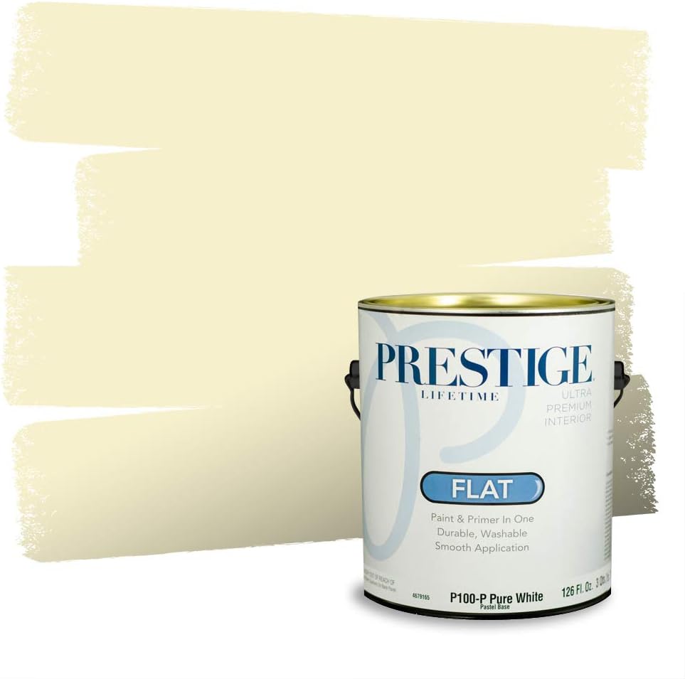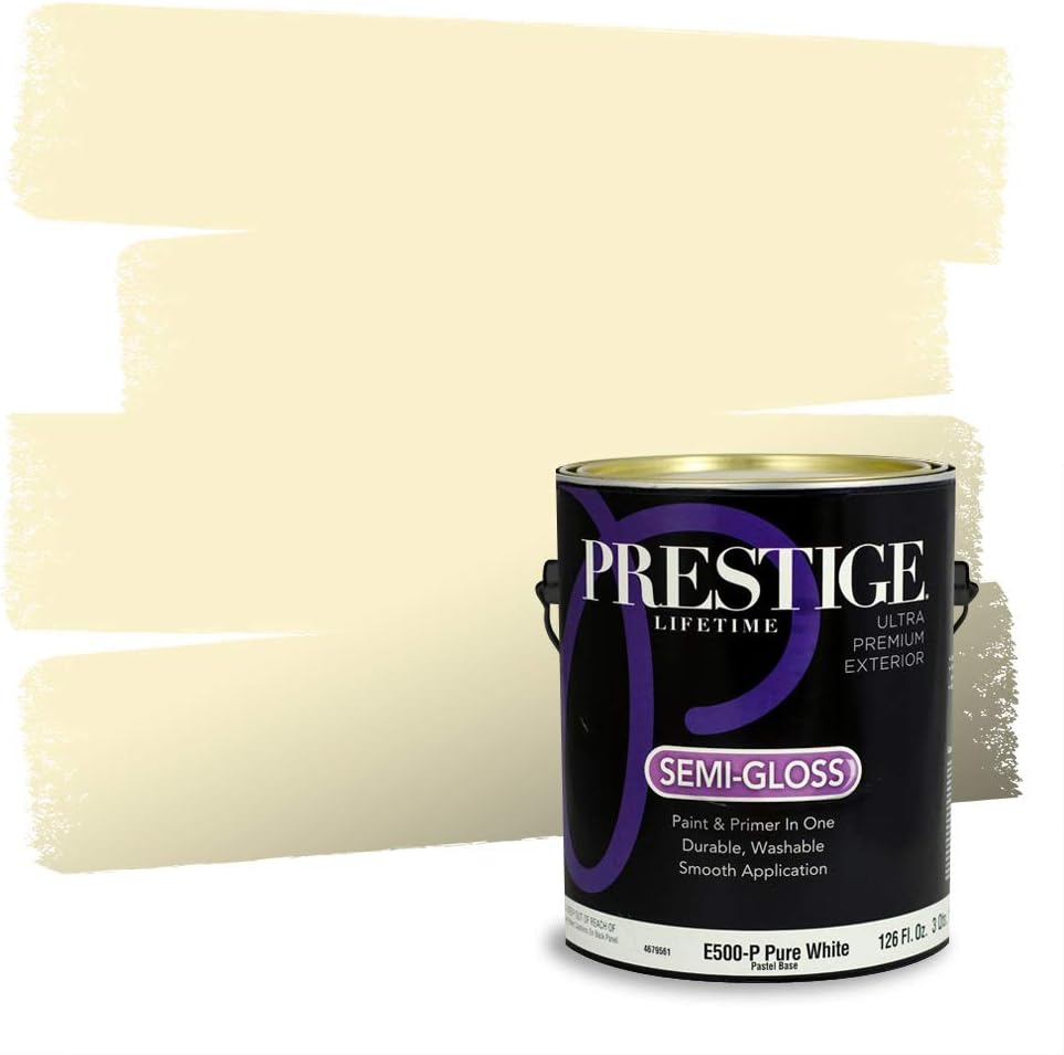 Prestige Paints 100% acrylic exterior latex paint and primer in one is a high end paint intended to be used on exterior surfaces including properly prepared wood, masonry surfaces, cement board siding, vinyl*, aluminum, and factory primed siding. (Note: when painting vinyl siding do not paint with any color darker than the original siding. Painting with darker colors may cause the siding to warp.) surface Preparation: remove dirt, mildew, grease, wax and soap residue, loose and peeling paint. Glossy areas must be dulled by sanding. PRIME all bare, new wood and factory primed wood with an oil base primer. PRIME masonry surfaces including cementitious siding with a latex primer. Application: Stir or mix paint before using and intermix all containers for color uniformity. Apply as is with a high quality brush, roller or pad painter. Thin sparingly with water if necessary for spraying. Do not overspread. Temperature must be above 50 F (10 c). average coverage 400 sq. Ft. (37 square meters) per gallon (3.78 L). for best performance, apply two coats of paint on new surfaces after priming. Do not use indoors. Dry time: Dries in 1 to 2 hours. Allow to dry overnight before coating. Low temperature or high humidity may increase dry time. Cleanup: use warm water and soap. A flat finish provides a smooth, uniform look. Flat or "matte" finishes get their name from the lack of reflection from the painted surface. This is one of the benefits of a matte finish, because it helps hide surface imperfections, such as dents, nail holes, or patches. Flat finishes often require fewer coats than semi-gloss and gloss paints and also are easier to touch up because there is less contrast between the touch-up paint and the rest of the painted surface. *Prestige paints uses proprietary base paints and tints to create and match colors. Prestige Paints works with industry leaders in paint color to match the color on this page based on the color specifications of the original to create a comparable color. Prestige Paints is not offering the ACTUAL branded color or paint product for sale and is not associated or affiliated with the color-referenced brand. Prestige Paints reference to any trademark is for color comparison only. Actual paint colors may vary from on-screen and printer representation. Note that color can vary due to sheen, light, surface, and application method.
