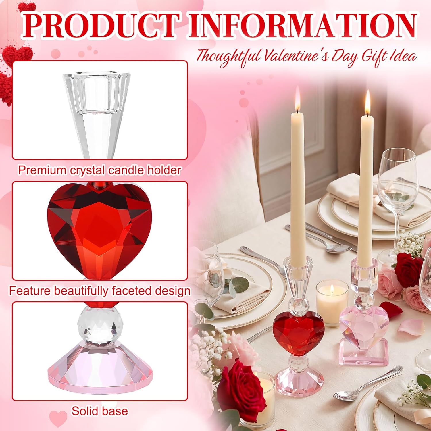 Features: Seamless decor integration: Whether on a mantel, windowsill, coffee table, or bookshelf, these candle stick holders easily match various decor styles. Create a warm and inviting ambiance by incorporating them into any room's design with effortless ease Dual-purpose decoration: Expand your decorative options with these holders, which can also serve as chic vases for fresh flowers. Ideal for dinners or weddings, they offer flexibility and style as both heart-shaped candle holders and elegant floral displays Specifications: Material: glass Color: pink, red Size: Candlestick height: 6.7 inches, 8.9 inches Candlestick base diameter: 3.2 inches, 4.1 inches Package includes: 2 Pcs heart cut glass candle holders Notes: Manual measurement, please allow slight errors on size. The color may exist a slight difference due to different screen displays.