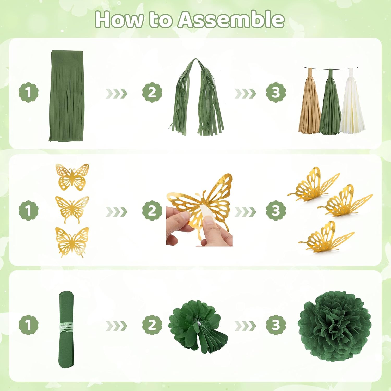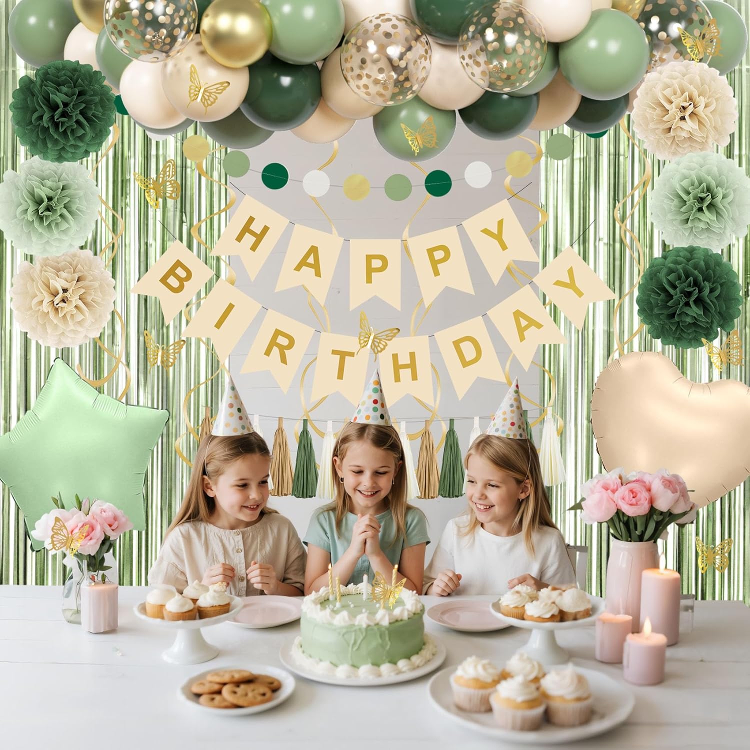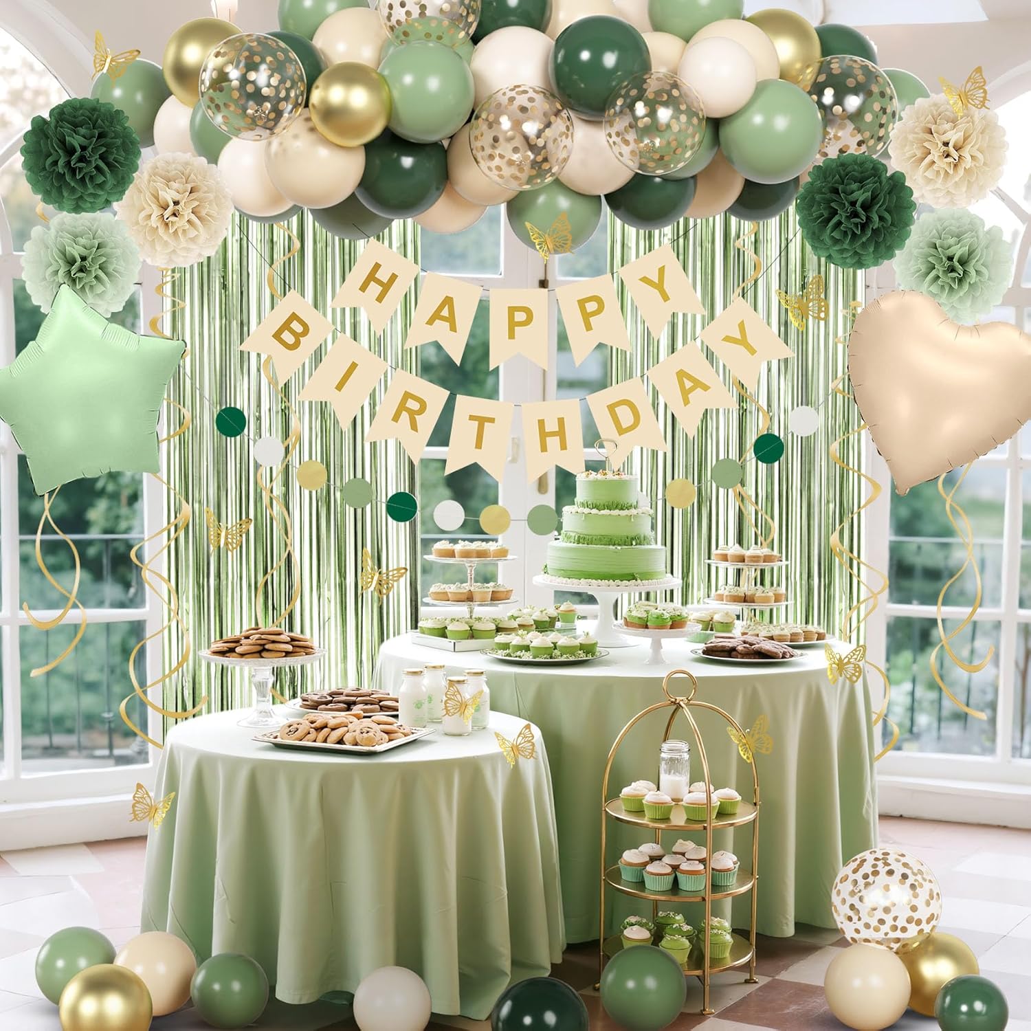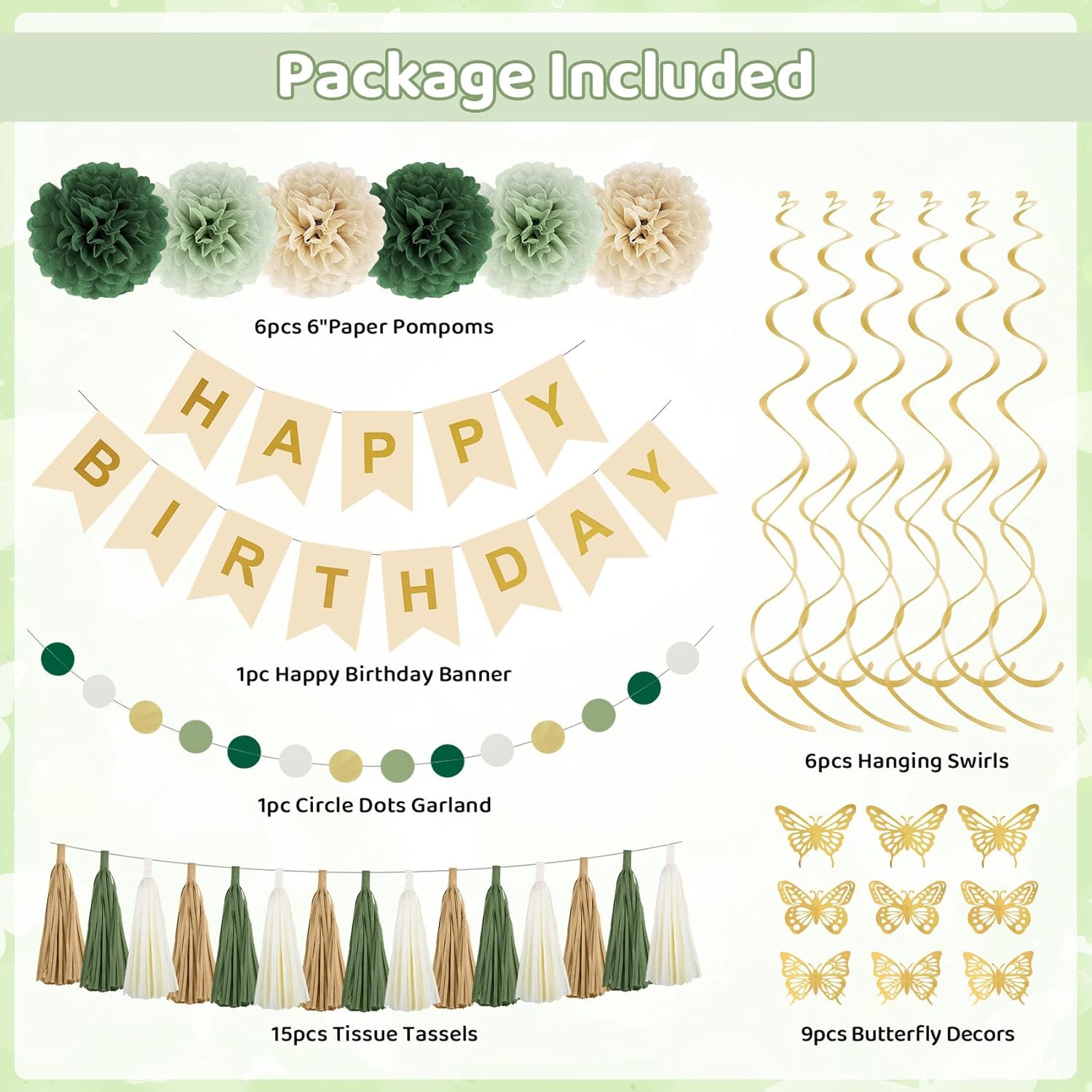 | Included Components | 2pcs foil balloons, 45pcs balloons, 2pc foil fringe curtains, 1pc happy birthday banner, 6pcs pompoms, 15pcs tissue tassels, 9pcs butterfly decors, 6pcs hanging swirls, 1pc circle banner, 1pc glue point, 1pc gold ribbon, 1pc balloon strip |