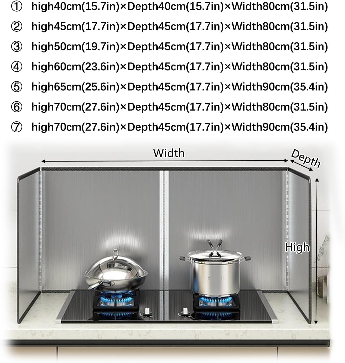 Prevent Oil Splashes: Our splatter guards for frying are designed to keep your stove and kitchen area clean by preventing oil and food spills during cooking. These guards are well insulated, protecting surrounding materials like plastics, spices, and cans from heat damage or deformation. They can also serve as effective food wash splash guards.Product Details:- Name: Stainless Steel Oil Baffle- Material: Stainless Steel- Style: Four-Piece Fold- Dimensions: 40cm high, Depth 45cm x Width 80cm, Height 70cm x Depth 50cm x Width 90cm- Color: SilverFeatures: Suitable for various house types, ensuring safety and hygiene.Notes:- About size: Please note that due to different measurement methods, there may be an error of 1-3cm.- About service: If you have any questions, feel free to contact us, and we will respond within 24 hours.