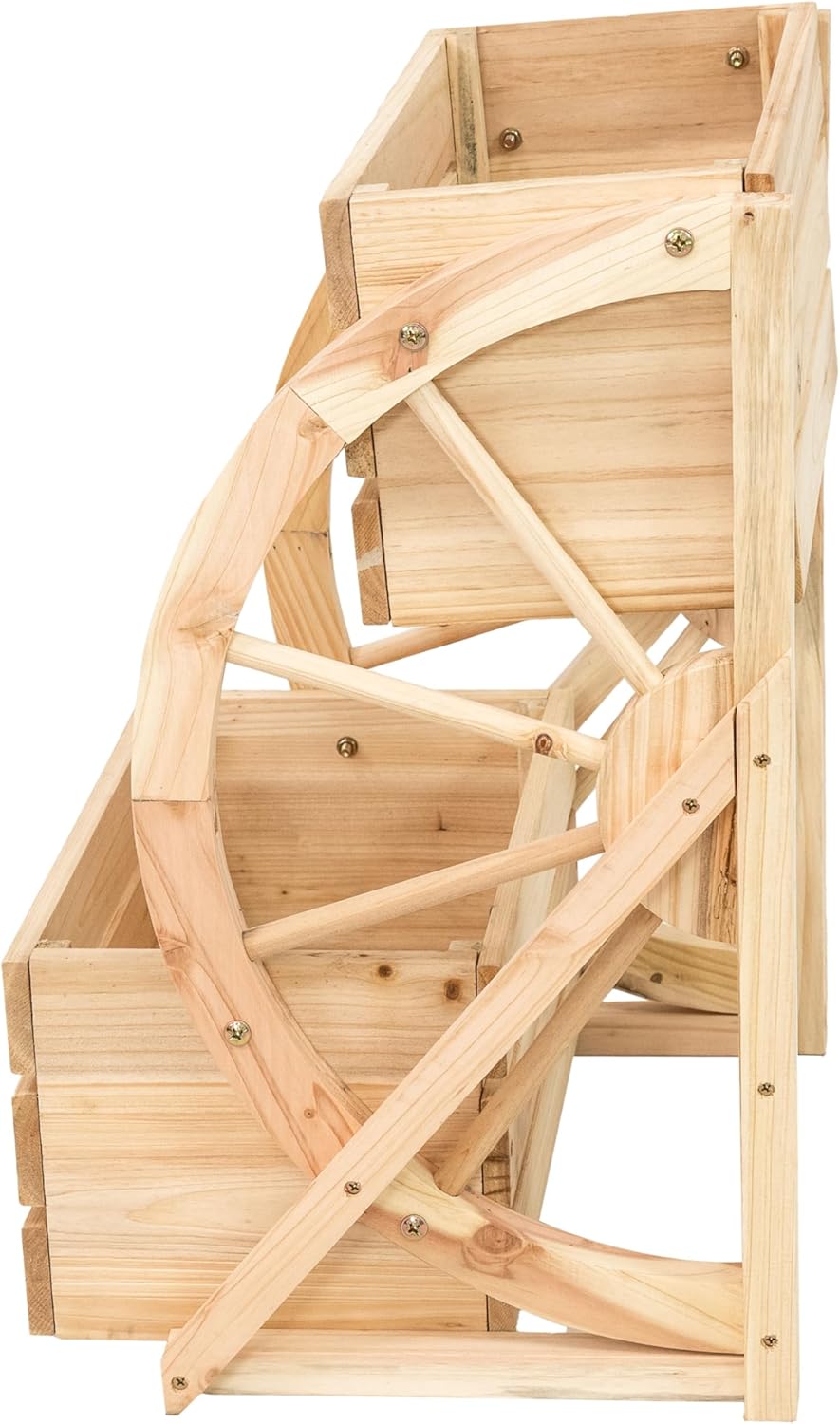 Add rustic style to the patio, garden, or front porch with this unique wagon wheel 2-tier wooden planter for outdoor plants. Made from natural fir wood, this stylish yet sturdy outdoor tiered plant stand features two tiers to display a variety of plants and flowers. The angled design makes it easy to see all of the flowers and plants grown in each box. The tiered wood planter is stained for lasting durability and a stylish look that will complement a variety of decor styles and outdoor furniture. The top tier has a 2.97-gallon soil capacity while the lower tier has a 4.4-gallon soil capacity. With a wagon wheel positioned on either side of the planter and a slatted box design, this raised tiered planter box stand will add Western-inspired, country style to the yard or deck. Putting this planter together is simple and all the necessary hardware is required. Two people are recommended for assembly and a screwdriver is required (not included).