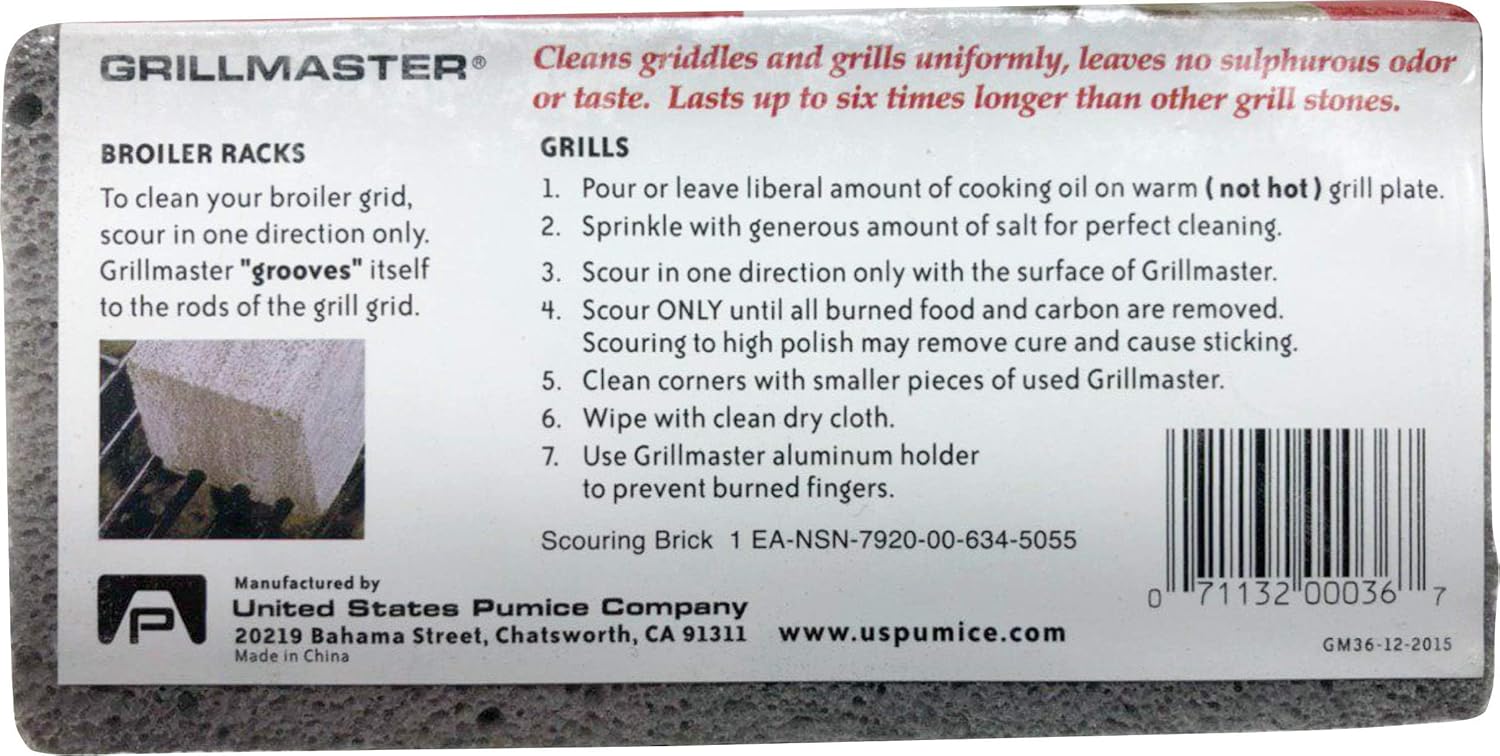 Cleans griddles and grills without removing the cure Grillmaster natural pumice grill stones are odorless, tasteless scouring bricks that clean griddles without removing the cure, or imparting unpleasant odors or flavors to the grill. Grillmaster bricks are safe to store and use on food equipment. They have been the choice of professional chefs for over a quarter century. Cleans uniformly without leaving low “hot Spots.” Won’t remove the cure like chemical agents. Imparts no sulphorous odor after taste. Leaves no glassy particles. Outlasts cheaper bricks and screens. Directions for use Cleans through abrasive action. Always use brick in the presence of water or oil. Charcoal and Gas Barbecues To clean hard metal and porcelain fire boxes, covers and grill and broiler racks: wet brick. Rub surface to be cleaned using gentle pressure. Rinse or wipe cleaned surface of residue. Your Grillmaster Grill Cleaner will shape to flat or curved surfaces. "Grooves" itself to cooking grids. Pancake and Fry Griddles Coat warm but not hot griddle with cooking oil. Scour griddle using flat side of stone. Work in one direction. To keep oil cure and prevent sticking, clean only carbon and food from griddle. Wipe cleaned surface of residue with dry cloth. DO NOT USE on unbaked enamel finishes, plastic coated surfaces and soft or highly polished metals. Some decorator tile and colored porcelain is fragile and may be damaged by abrasive cleaning materials. When in doubt, test a small area before proceeding. 6' x 3' x 3', Pumice Cleaning Brick, Safely Removes Baked On Food & Grease From Grills & Griddles, 100% Pure Block Pumice, Is Safe To Use On Porcelain Coated Grates & Won't Harm Surfaces, Brick Forms Itself To The Surface Being Cleaned.
