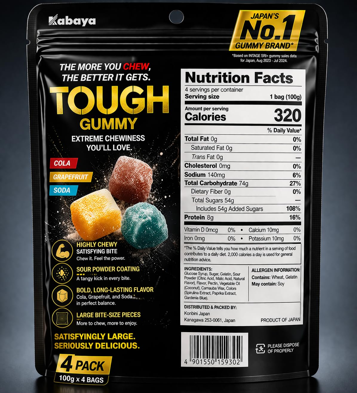 Experience the ultimate candy sensation with Kabaya's Tough Gummy - Japan's #1 choice when you need an intense flavor boost! Each 100g bag features large, cube-shaped gummies. Available in three bold flavors. This convenient 4-pack ensures you'll have plenty to enjoy or share. Each gummy piece is generously sized and individually dusted with flavor-packed sour powder that intensifies the taste. The striking black packaging with bold golden lettering reflects the premium quality and powerful flavor impact within. Whether you're craving something sweet, sour, or simply need a tasty pick-me-up, these Japanese gummies deliver an unforgettable candy experience that will keep you coming back for more.