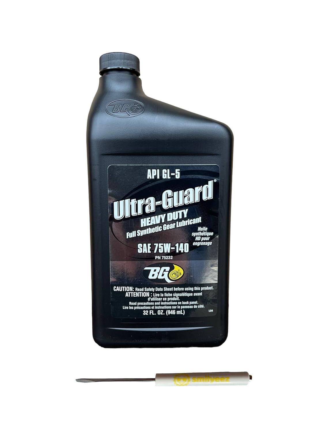 BG Ultra-Guard Heavy Duty Full Synthetic Gear Lubricant SAE 75W-140 PN 75232BG Ultra-Guard Heavy Duty provides the ultimate protection for drive line components. Specifically designed for heavy duty and commercial vehicles, it has superior thermal stability, smoother gear shifting, optimum drive line efficiency, quieter operation, protection against wear, pitting, and corrosion, seal compatibility and improved seal performance.The hypoid gear set design demands that a high level of extreme pressure additive be utilized for long life performance of the ring gear and pinion. The high level of extreme pressure additive in a GL-5 type product can be aggressive toward yellow metals utilized in many standard transmissions or transfer cases. BG Ultra-Guard Heavy Duty will withstand the punishing effects of extreme heat and arctic conditions and is one of the few polymer-free gear lubricants to meet the stringent requirements of Ford engineering spec WSL-M2C-192-A. It can be used in all conventional and limited slip differential hypoid gear rear axles. Includes a Smilyeez Pocket Screwdriver.
